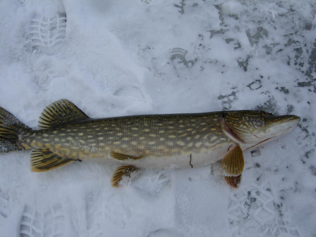 Ледобур легко преодолевает не толстый лёд и десяток лунок готовы,остаётся их проверить,но как и вчера - ноль.Ещё десяток лунок и на девятой на блесне приятная тяжесть,недолгая борьба и щучка на полтора килограмма на льду,вся в пиявках.На воодушевлении ещё одна строчка лунок и на третьей опять поклёвка,на сей раз чуть меньше кило,руки уже не дрожат как после первой.Через пару лунок ещё одна под килограмм,на этом и всё.