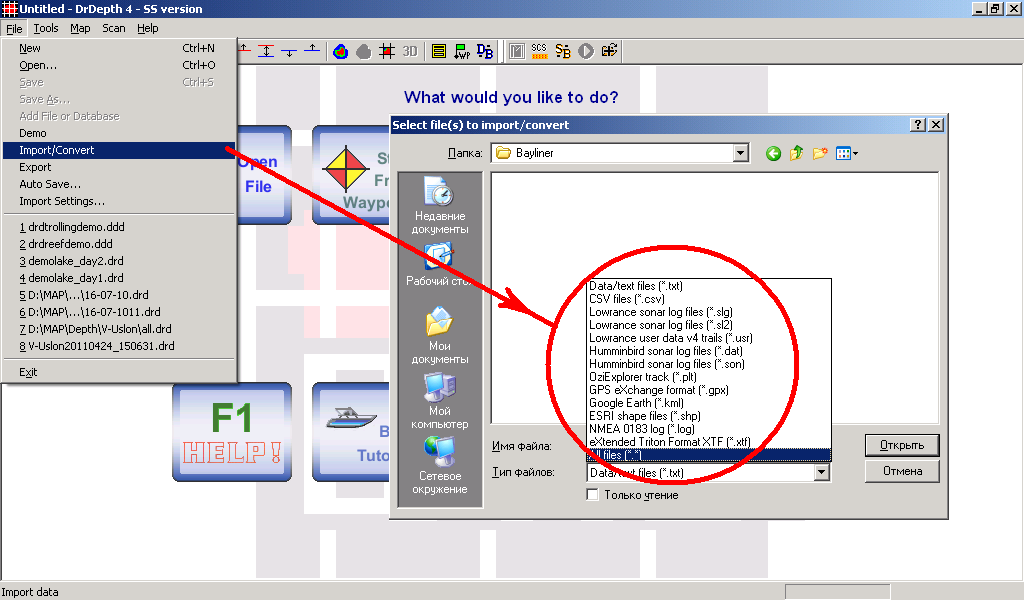 кривых точек (с нулевоё или не реальной глубиной), потом сохраняю его в формате gpx. за тем открываю файл Exel-м и