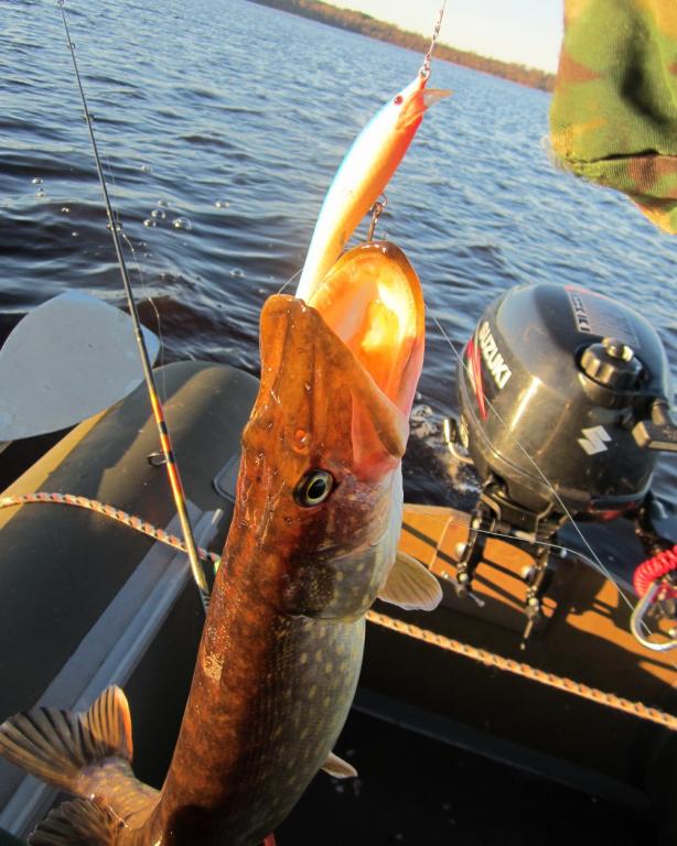 Погода сегодня порадовала, с клёвом как-то не очень. Редкие и в основном холостые загибы происходили на крупные приманки кислотных расцветок. На "ОК"14 см.- расцветки "клоун" обидно упустил монстера у лодки...