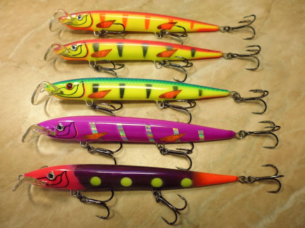 Парочка воблеров также одни из первых. Материал - липа, акриловые краски "Декола", финиш - лак "Maxima", покраска все тем же зубографом. Плавающие. Длина 50мм, вес 7,5гр. и 8гр. в соответствии.