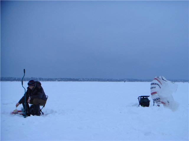 На подъезде к озеру встретили знакомых рыбаков, которые проговорились о заказанной развозке из Кальмакюла в район летних подвигов:) Решение созрело быстро и в порядке живой очереди были доставлены на место ловли. Первые лунки для меня были самыми резульативными. Окунь, временами и неплохой, начал поклевывать и на секушку и на мормышку, с небольшими перерывами. После 14.00 клев выключился. Стало холодно, палатка была замечатеьным способом спрятаться и чуть погреться. Уже под конец царапнулся в балансир со дна налим, но оставил на тройнике кусок губы и сбежал. Еще одним сюрпризом стала поклевка сижка на балансир просто висящий в полводы. Небольшой, грамм на 150, но уже с разодрнным хвостом. Был осторожно отпущен.