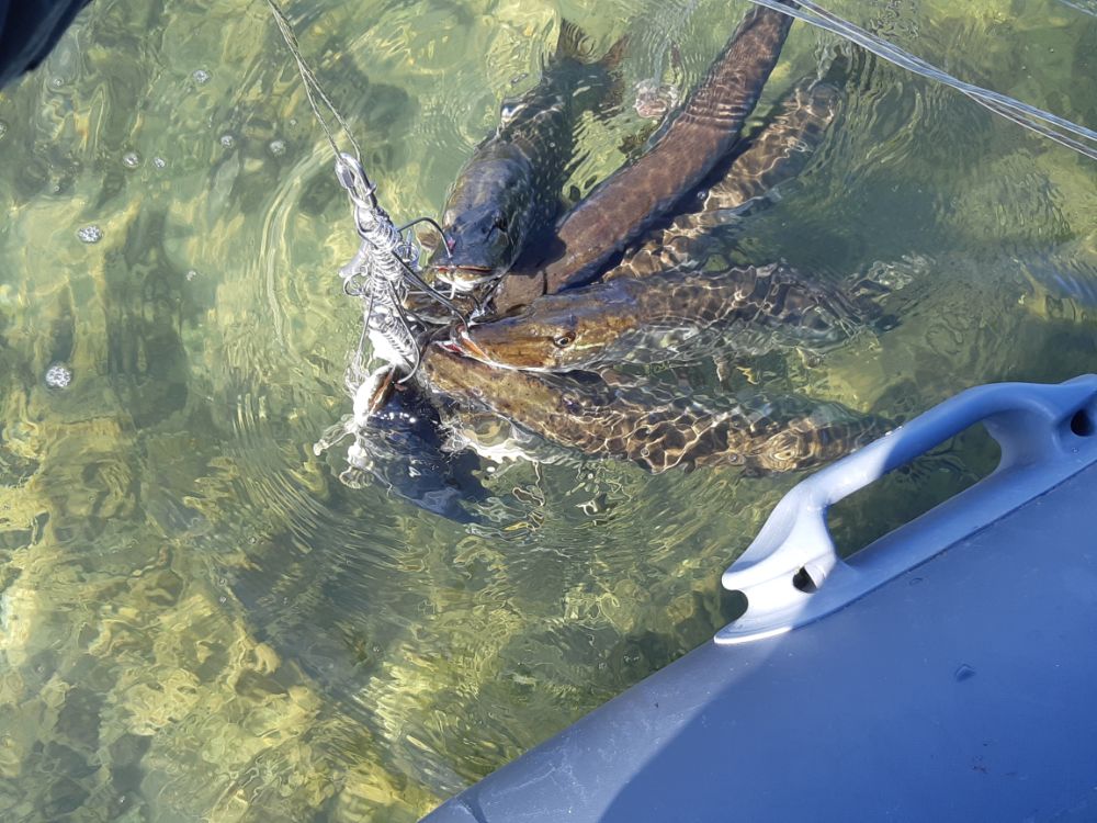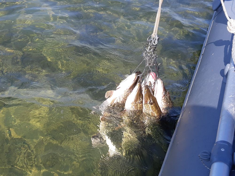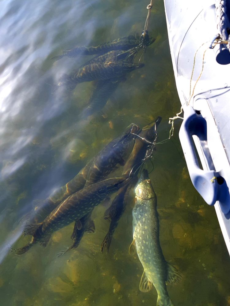 Иногда за губу, были моменты когда просто сопровождала до лодки, при чём у всех. Просто зарывала рот. Таких моментов не счесть. Потом опять начинала хавать. При чём опять же у всех. Так и сопровождались такие смены. То берёт, то нет. Но по большей части всё же было клёва. Если бы забирали всё что поймали, то хер бы подняли на лодку. Отпускали очень много. Да и в конце рыбалки, бОльшую часть отпустили с куканов во свояси.