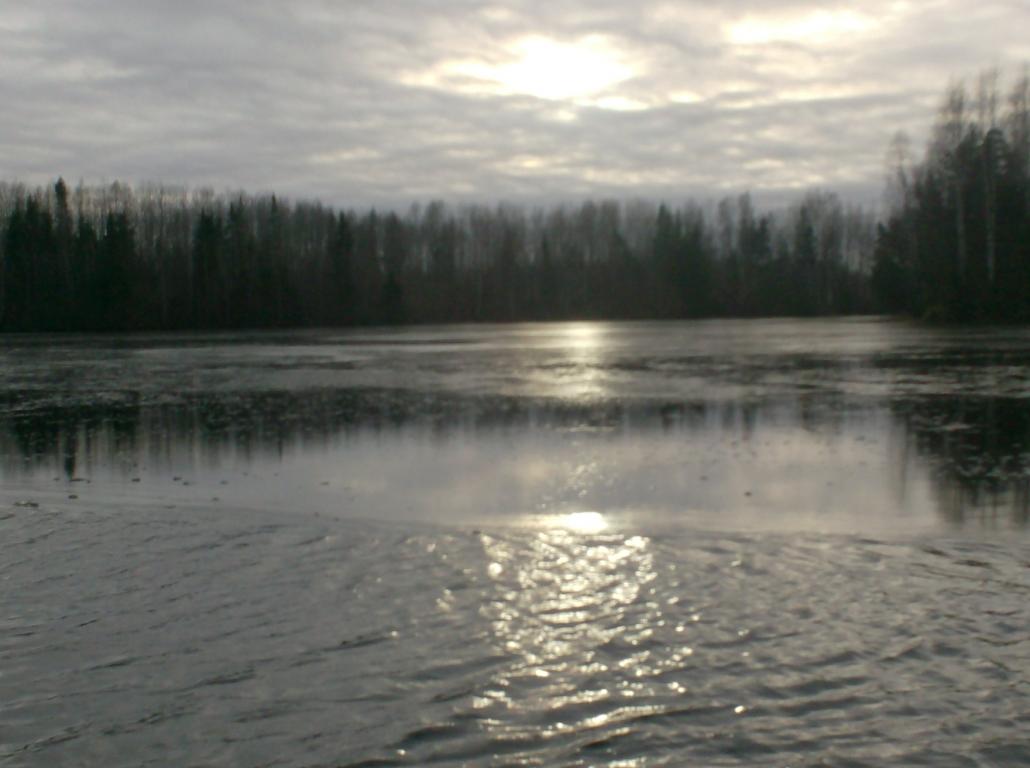 Позвонив на базу в обед,на вопрос:смогу ли выйти на лодке?-В ответ услыхал:лёд,но выйти можно.Как то неуверенно эти слова прозвучали.Подъехал в третьем часу пополудни и улицезрел картину:(некоторые фоты не проходят) К слову сказать две лодки стояли на приличном удалении от берега(стояли на яме),молодцы ребята,видно пробивая от полыньи к полыньи проход добрались до нужного места.Я пошёл по их следам,не так то и просто,они прошли на моторчиках,а вёслами особо не размашешься,да и лёд такой,что впору пёхом топать.А начинал мешкаться,ветер гнал лодку обратно к берегу.Пришлось плыть задом вперёд На этом месте и решил тормознуться.Ну не клювало,эт у меня обычное явление,ничего удивительного,и у меня глубина казала восемь метров.Стемнело,ветер со льдом затянули мотив,в котором перемешивались,звон стекла,с гомоном гусиных стай;что-то средне между этим.Как то потихоньку,стало неслышно льда,ветер же не стихал,как бы не начало нести его.Что-то не так,пригляделся а он уже и плывёт,и в лодку начало постукивать,и рябь,местами стала пропадать.Ясненько надоть быстренько сматываться.Как обычно чутка не успел.То место прошёл лётом,где еле пропалзал,а вот к берегу пришлось пробиваться сквозь ледовую кашу,мал-мала попател.Но всё хорошо,что хорошо кончается.