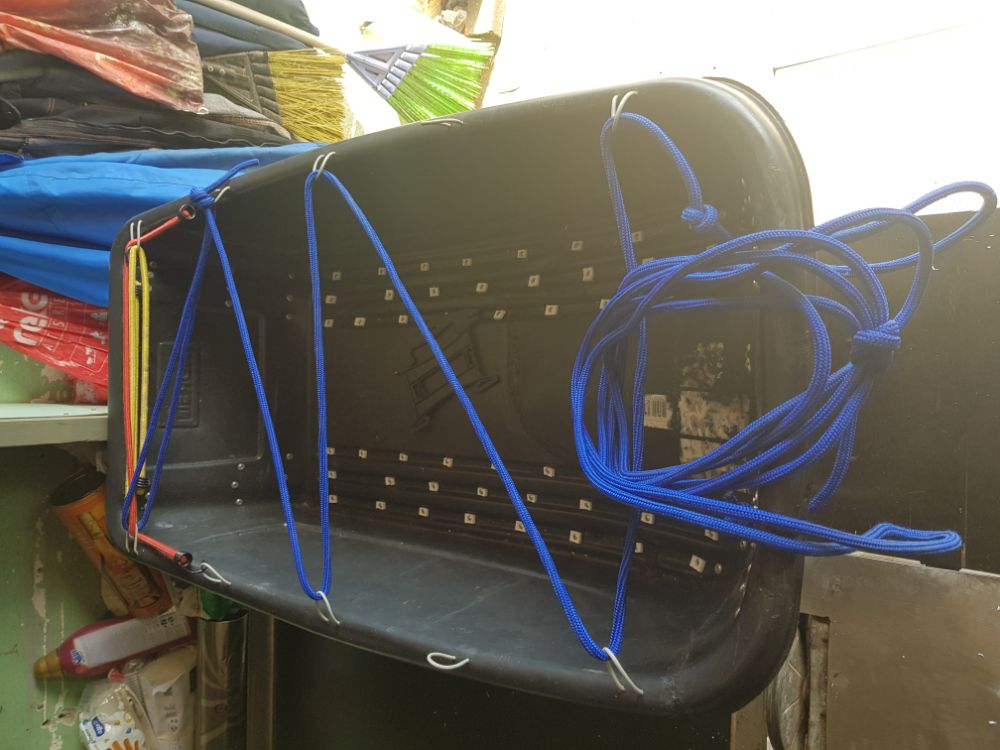 всё замечательно наматывается на мотовило и хранится прямо в саночках. Да, ещё надо будет сверху установить тонкую верёвку для крепления резиновых стяжек, хотя вроде ни чего зимой не теряли, но как говорится бережёного бог бережёт, не помешает.