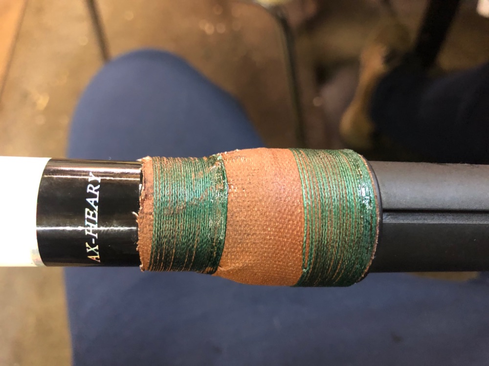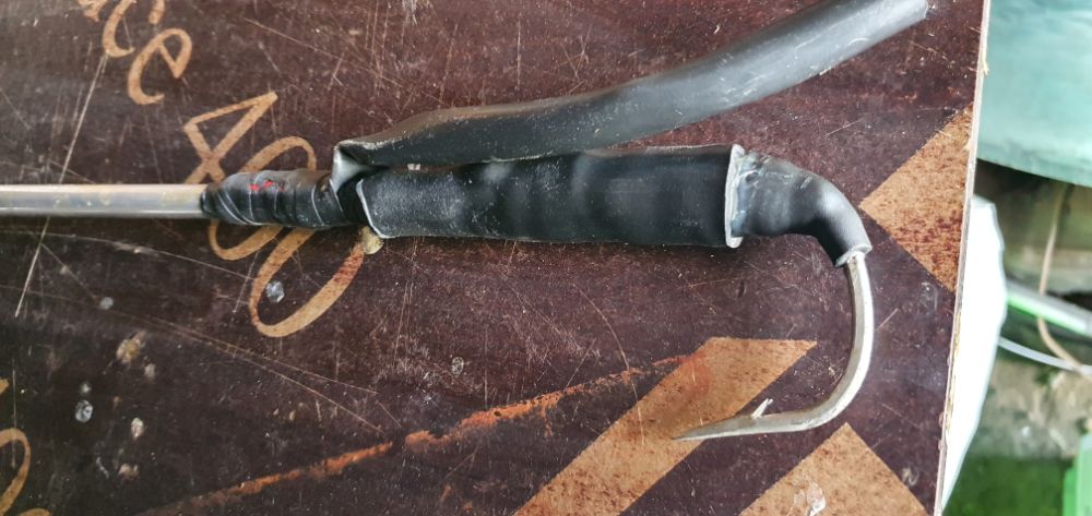 В прошлом году решил проблему способом наших предков, только использовал современные материялы, а именно ленту самоклеющуюся из резины (сырая резина в народе, на фото видна примотанная защита крючка ей ). Обмотал тонким слоем конец спининга, приложил крючок и его примотал плотно. Сверху поставил термотрубки с клеем, один сезон продержался, проблем не заметно...