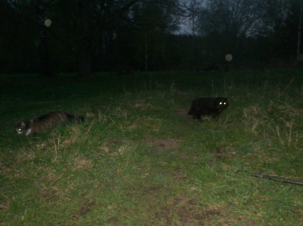 Вернёмся к самой рыбалке.А вот тут не так весело.Продолжается игра в:поймал-отпусти.И ни чего не могу поделать.На удочку вооще оказалось-пришлось отказатся,трудно сказать,успевал ли крючёк до дна опускаться,или же наживку начинали рвать на части ещё на лету.На фидер тоже было не весело:заброс,тырк-тырк,и два варианта,либо крючёк уже гол,либо там уже повесился очердной камикадзе.Из более менее рыбов три подлеца за весь вечер Но нужен был лещ.Варианты насадок:кукуруза,навозники,сметалось враз мелочёвкой;опариков особо ни кто не жаловал,но глодали до кучи.Выползки,выдерживали какое-то время,но трудно ждать,когда не знаешь,есть ли ещё что на крюке,либо там опять надо кого-то спасать.Начинало смеркаться,послышалось:Мяу,на два голоса,и действительно гости пожаловали а я тока все бутики умял.Правда был ещё хлеб,предложил,не отказались.Хлеб кончился,подошли ещё гости,пять насчитал,пришлось расправлять удочку,ну и пока ещё чего то видать,подловил им на закусь.Совсем стемнело,собрался,пошёл покимарить,с надеждой на утро...