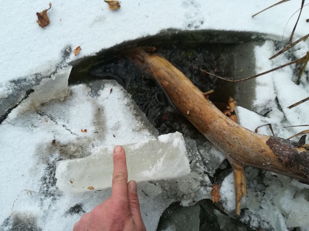 Пытался сезон открыть твёрдой воды на реке со скромным течением, не особо получилось, лёд как буд-то есть и в то же время нет. Получается пятый день, как лёд встал;а вот морозики слабоват, расти не получается. На русло выйти не отважился проплешин много, прошёлся по глубинам полтора-два метра, прошёлся это громко сказано, разве что не по пластунски. Хотя первая проба льда выдала аж целых шесть сантимов хорошего льда, чуть от берега не от толщины не от хорошего льда не оставалось и следа. Надоть обожать малёхо.