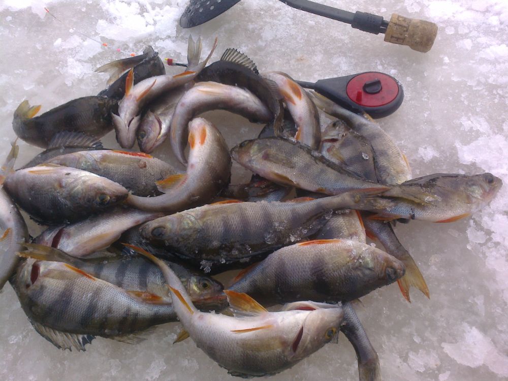 Вода, пока я ловил мористее, у берега заполонила всю площадку с моими лунками. В 14ч, как и всегда, окунь рот прикрыл. Заглянул в пакет. На сковородку, измазать свежей кровью, поимел. Пора и честь знать. Чуть за две дюжины наобманывал. Удачи вам господа!