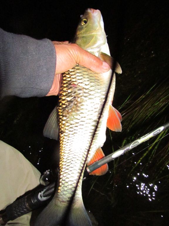 Ребята прибыли на мой участочек и начали выбивать рыбу уже тут. Я долго не мог определится, что же мне взять из прутков для продолжения ловли и в конце концов решил половить "дружком" которому всё по "ФЕНЕ", это фамилия такая! Ростом он явно маловат для такой реки, всего 2.18 м. и силой не блещет, тест до восьми гр., но мне так хотелось ему показать как клюют голавли и как они себя ведут на крючке, что я не удержался... Дистанцию на забросе я решил подравнять 0.08 мм. шнурком косоглазого производства. Приятненько так всё летит и на твичь отзвываеться бланк без провисов. Вот и первая серьёзная поклёвка. но мимо. Гриша опять тянет рыбу. У Андрика сходы. Ну наконец - то и я вкалываю лобастого. Очень приятно побороться на струе с сильной рыбой при помощи такой зубочистки. Прям как с игрушечным пистиком идти брать банк! Место пройдено до мачула и время перебираться на новое.