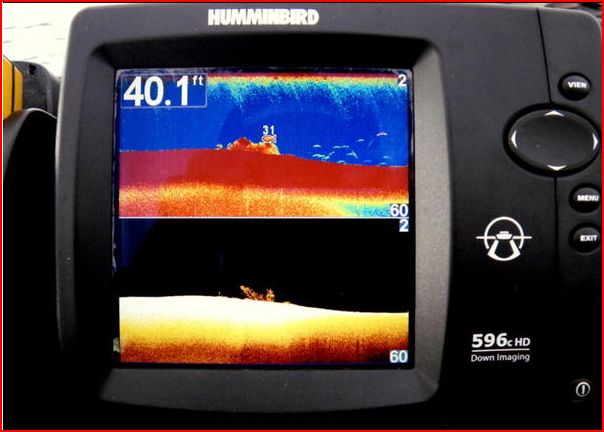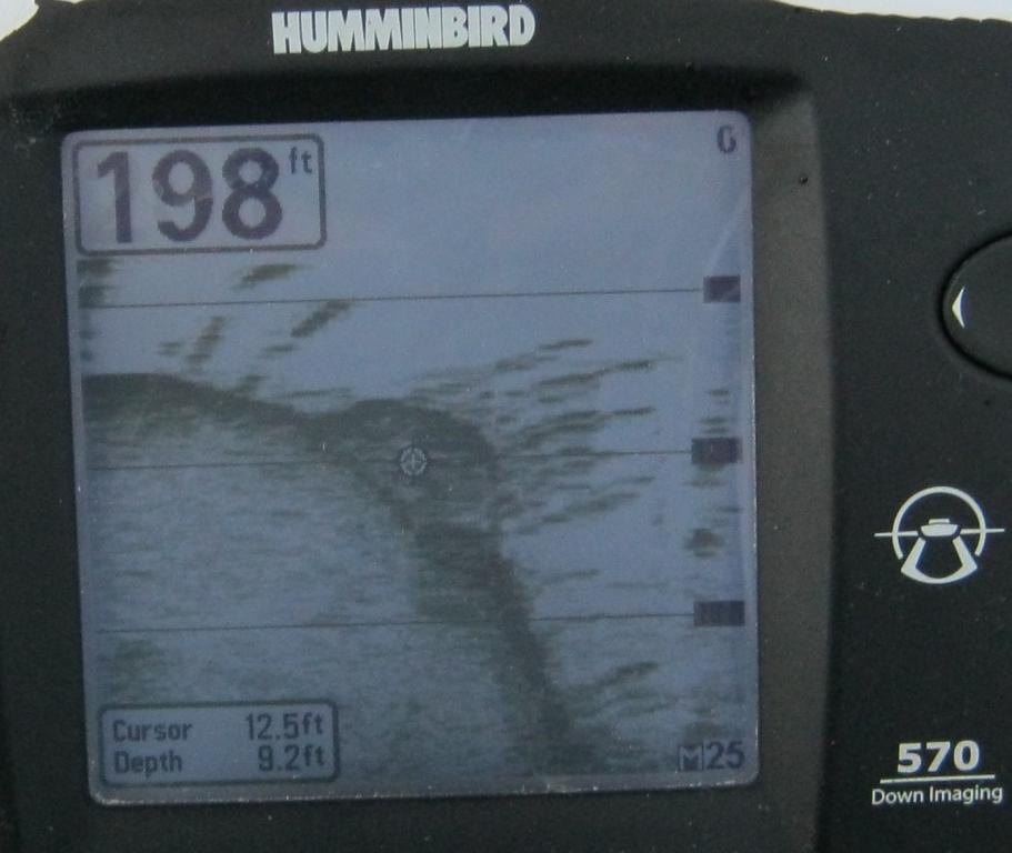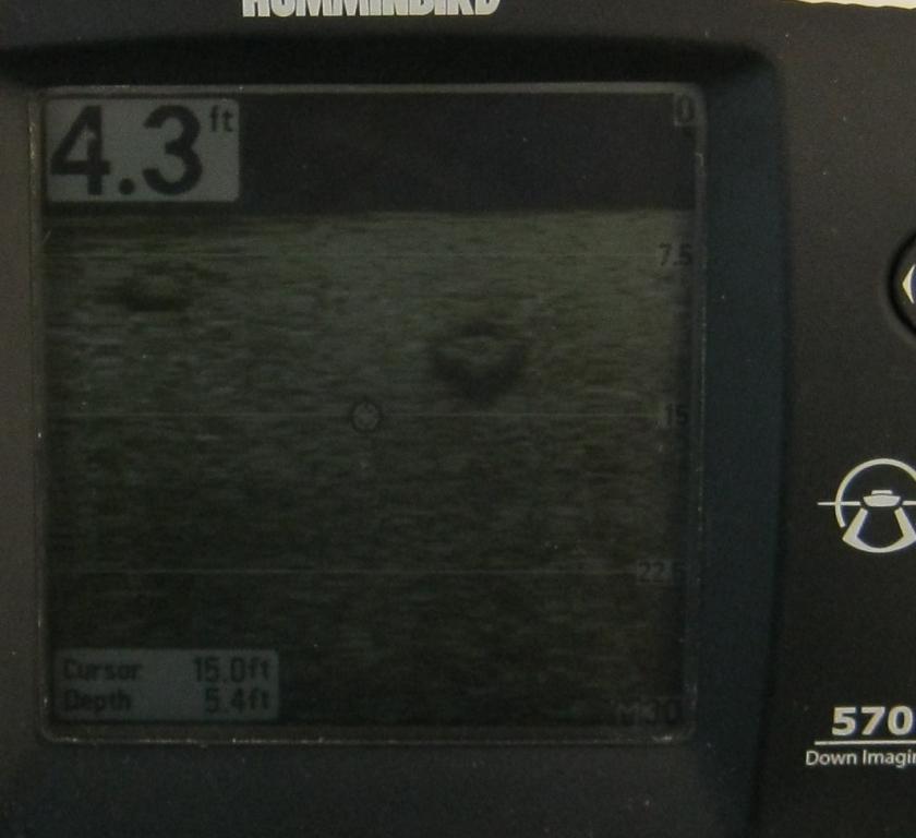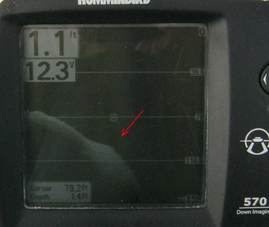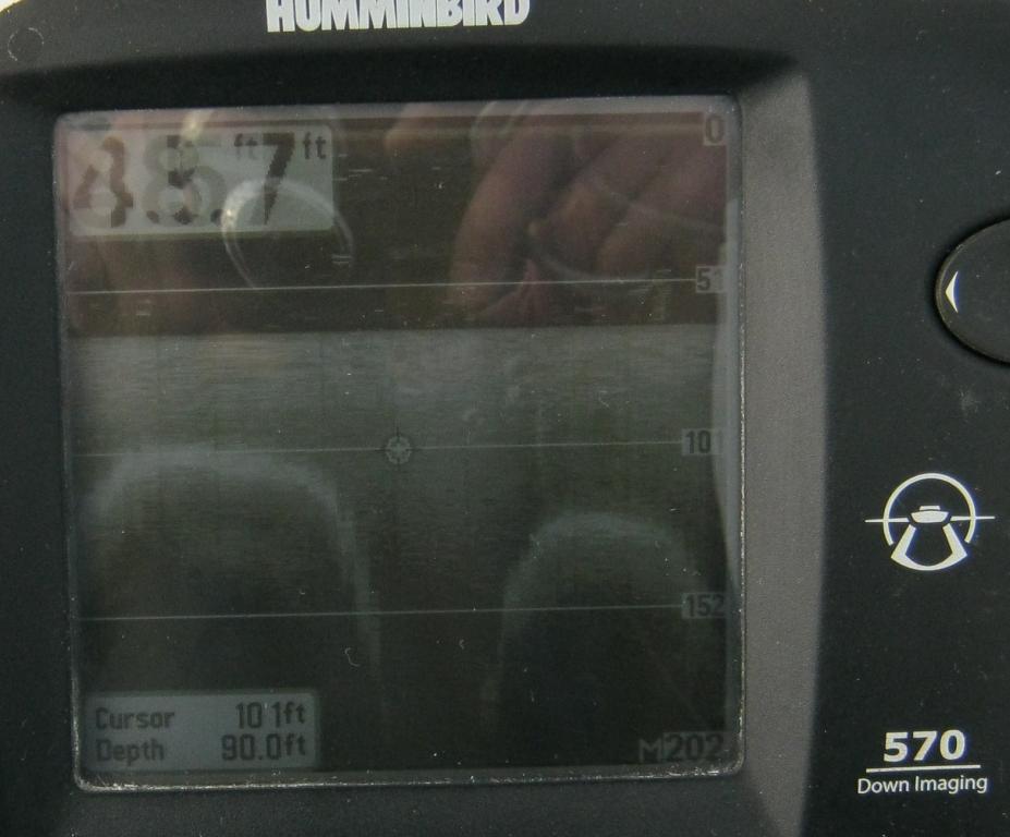 Весьма доволен использованием плоского сканирующего луча для наблюдения рыбы с берега. На первом снимке видно как рыба обступила придонный поплавок и крючки с наживкой в 15м от берега. На втором нырок (утка) пронырнул над этим же поплавком (40см от дна):