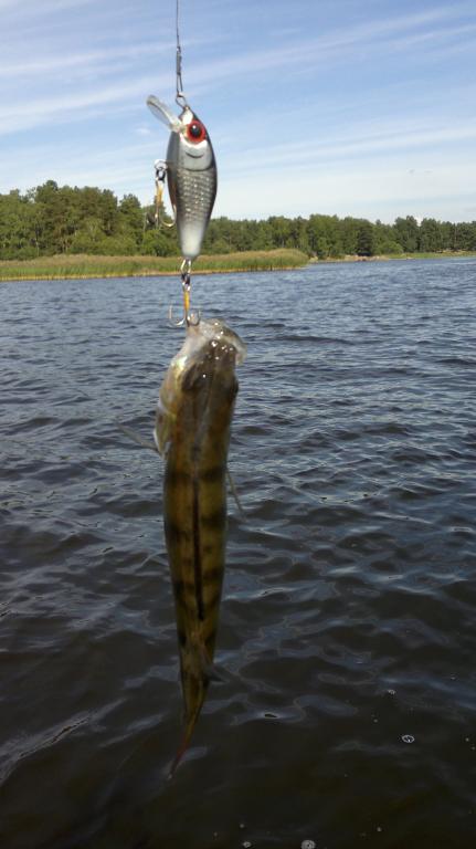 Надо сказать, что поймать рыбу даже не надеялся, так как был очень яркий день, вода прозрак, да и 12:30 на часах - полдень. Участок реки до сей поры был для меня незнакомым, слепни приняли меня тоже, как незнакомца - атаковали со всех сторон, пока я не попшыкался средством. Спустившись по крутому берегу к холодному потоку, начал высматривать удобное место для тестирования. Слева от меня (вниз по течению) увидел расширение русла и судя по всему довольно глубокую яму. Цепляю воблер без карабинчика на лесу и делаю заброс. Ультралайтовая Abu-шка Vendetta, в сочетании с катушкой Mitchell Mag Pro Lite 500 с матчевой шпулей, без труда посылают 2 грамма приманки на другую сторону ямы, обходя нависшие над потоком еловые ветви. Вроде воблер пошел активно, ровно - даже кольцо гнуть не надо, но явно маловато огружен, такое чувство появилось на первой проводке. Но на пол-дистанции я вижу, как с придонной области отделилась "торпеда" и не успел я опомниться, как спиннинг согнуло в дугу и завизжал фрекцион. Я начал работать как руками, так и сердцем