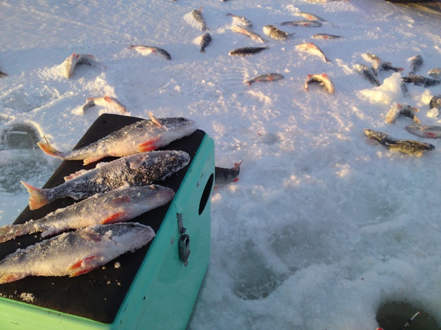Как обычно, кто-то высиживал и приманивал рыбу, подкидывая в лунку мотылька, а кто-то гулял по снежной каше и бурил лунки. До обеда, ни у тех, ни у других особых успехов не наблюдалось