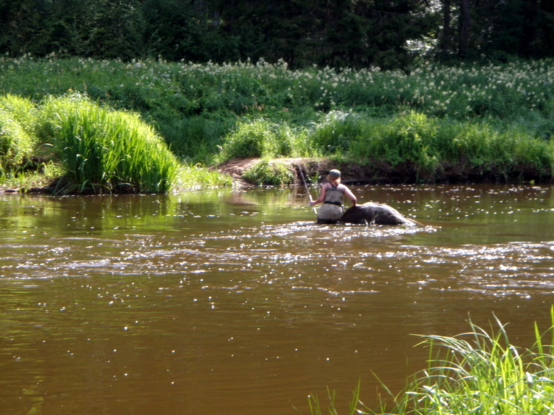 Хотя как это не странно буквально на первом переливчике получаю пару голавлиных тычков , но как это уже повелось без результатных . Места начинаються очень красивые и перспективные . Река сильно петляет и если следовать правильной тактике переходов в брод с берега на берег , то получаешь колосальные возможности для облова . Но и тут наши латышеские бизнесмены ввели свои коректировки в мои планы . По реке рядами и колонами поплыли лодки и каное с разношорстными экипажами . С криками детей и спинингами в руках у серьёзных дядек . Поначалу я подумал о корпоративном сплаве какой - то фирмы и даже в душе порадовался за находчивость начальства . Ведь совместный отдых сплочает коллектив и как следствие даёт положительный заряд для будующей работы . И перекуры станут короче когда все будут вспоминать об одном совместном мероприятии , а не расказывать каждый о своём . Но , как всегда я ошибался . Просто предприниматели другого плана за манальные латышские чатлы предлагали всем желающим сплавитьса по реке из пункта " а " в пункт " б " . Не знаю каким количеством плавсредств сия фирма распологала , но мне показалось что флотилия была безконечной . Настроение и без того испоченое обьёмом отдыхающих на берегах , просто свелось на минус акумуляторной батареи . Уже почти не ловя а бредя вдоль реки я копался в своих мыслях . Даже музыку слушать не хотелось . Из ступора меня вывел крик коростели . Эту птицу слышно на растоянии больше километра , но так близко я его не слышал . Да и увидеть имел огромное желание . Долго я сиден на бревне , курил и играл с дергачём в прядки . Птица не покидала своего укрытиа невзирая на мои акуратные попытки и продолжала время от времени кричать на всю округу . В конце - концов я проиграл . Было жарко а вода у меня закончилась , что только добавило желания вернуться в лагерь .
