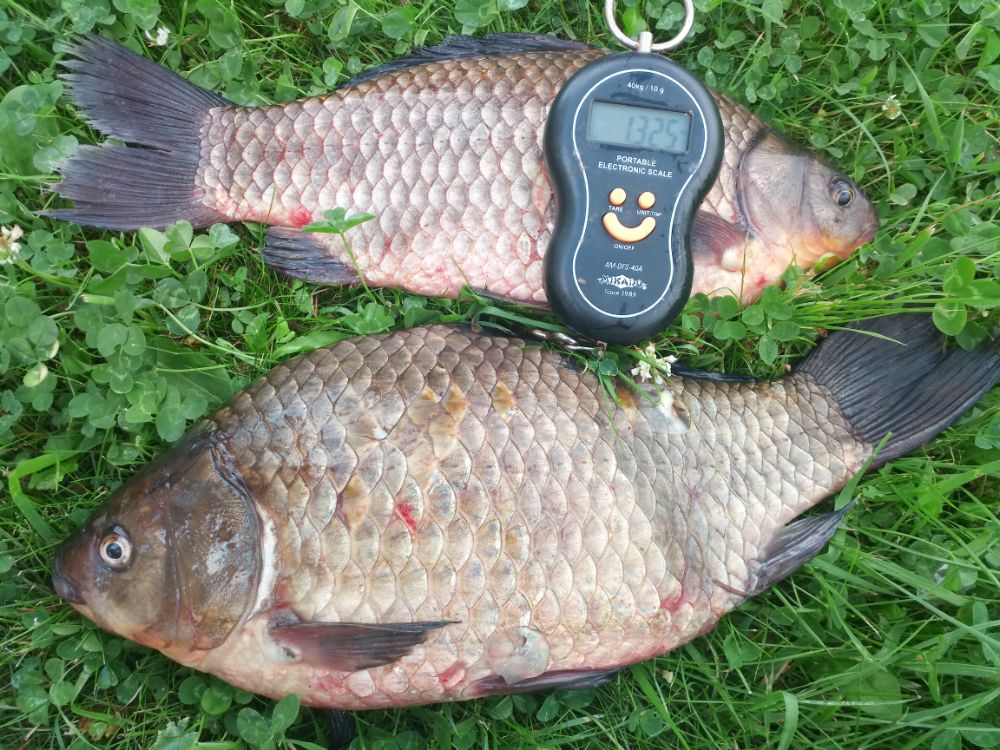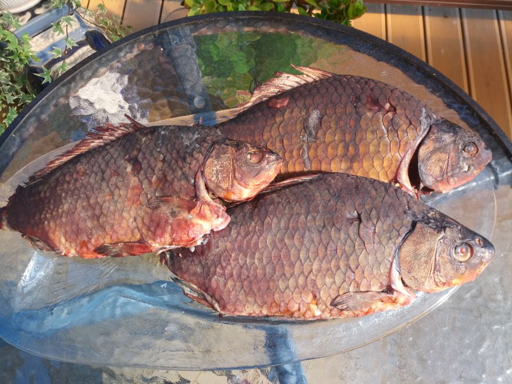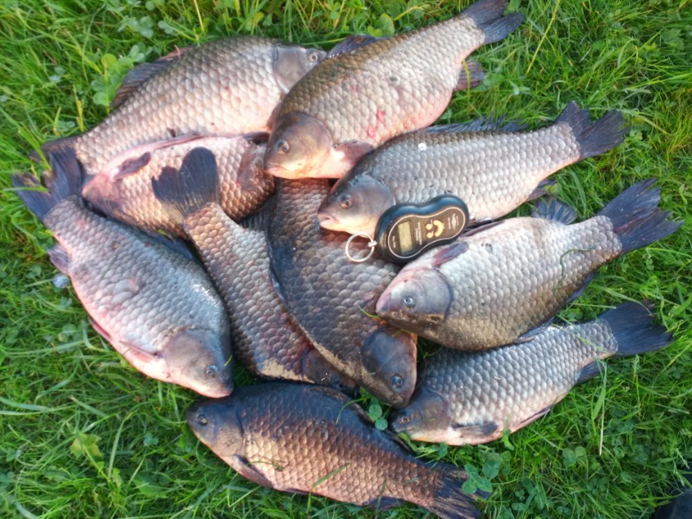 Карасик отозвался довольно быстро. Размер разный. Было весело. Немного поскучнело с часа до четырех. Далее клевало до отъезда. Накидал в садок 24шт. потянувшие в весе 23кг. Два самых красивых по 1.6кг. Домой на копчушку себе и приятелям забрал 10шт. в весе 13кг. Первый блин прошел не комом.....