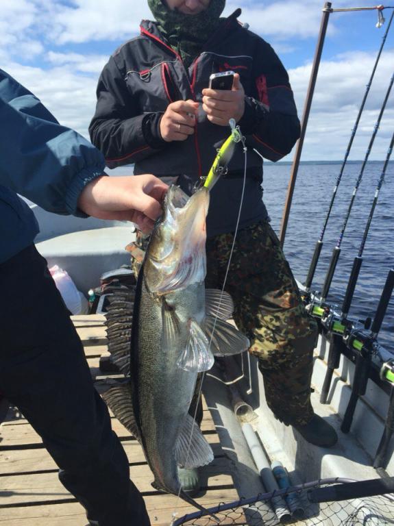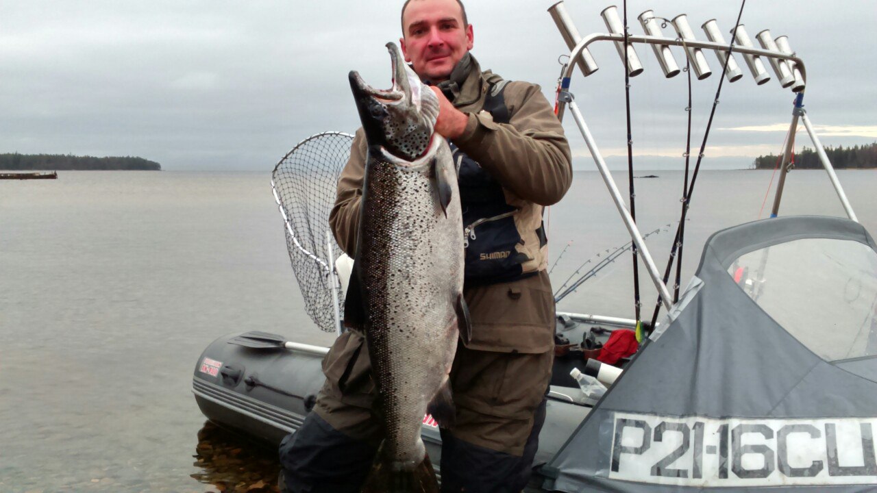 Был три дня на Онего. С погодой не повезло, но пару часов потролить удалось. Удача улыбнулась нам и мы поймали трофей. После 30-40 мин вываживания рыба в подсаке, руки трясутся. Лосось 12кг 100 гр.