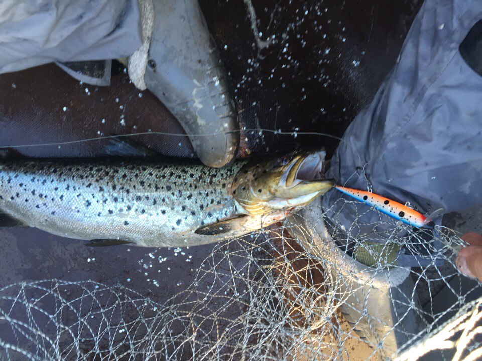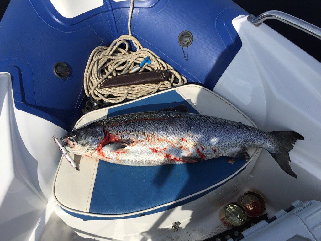 40минут борьбы и в лодке рекордный лосось на 14кг. Спасибо Антону, отличный подарок к дню рождения!