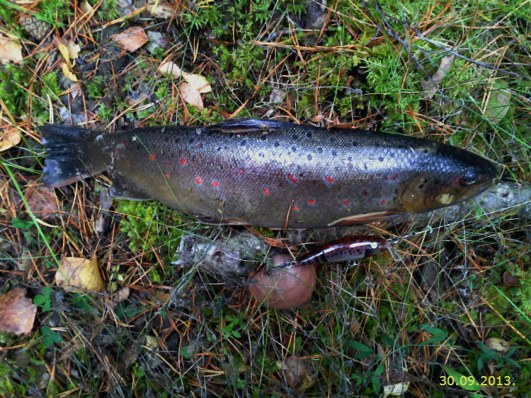 Сегодня решил совместить приятное с полезным - поехать на лососевую реку, что находится не так далече от столицы СШЭ (Соединенные Штаты Эстонии) и споймать небольшую кумжу, так как на Атлантов воды пока маловато. Взял ссобой свое последнее чудотворение-речных рачков шалунцов. Ход конечно был отрегулирован ранее и сегодня предстояло просто ловить, ловить на струе, в ямах, на перекатах и т.д. Река оказалась просто пустой (в плане крупных лососей), но на 2км хода, замученный донемагу, кидаю воблер в обратку. Сразу последовал удар, крючки Gamakatsu (сразу два, один за жаберную крышку, другой в рот) не дали не малейшего шанса речной форели. Рыба оказалась толстенькая с оранжеватыми вкраплениями, в полном нерестовом наряде.