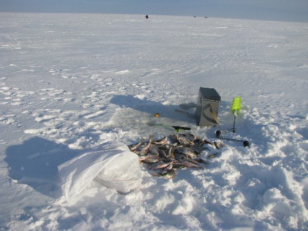 Ох и неуютно на улице...может, обратно в палатку?Ладно, погуляю пару часов...Отошел недалеко, метров 300 и уже с 3ей лунки начинает отзываться добрый окунь. Больше лунок мне не понадобилось. Ловил на пустую мормышку (без насадки)...В такой ветер сложно было придать мормышке нужные колебания, пришлось укоротить кивок, благо окунь ел так, что порой удары передавлись в руку.В общем, ловился окушок справно. Посидел часа 3 , решил, что довольно, 15кг доброго окуня,пошел в палатку, в комфорт.Ребятки в палатке раздухарились на столько, что на внутренней ее стороне образовался конденсат, а когда я открыл полог, внутри был воздух такой, что в пору топор вешать. Ребятки насверлили лунок, накормили их и малость потягивали окушков, ершей и плотвичек. Больше отдыхали, поэтому уловы не были большими.