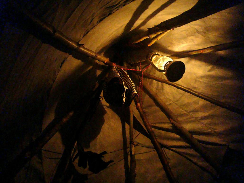 Остановились мы на берегу реки на поляне, которую облюбовали кабаны, которые ночью топтались вокруг чума. Для установки чума потребовалось вырубить 10 жердей толщиной с руку, на которую и был накинут тент. Печка внутри устанавливается достаточно быстро. И вот уже готовое жилье на три дня.Печка исправно горела всю ночь, при периодическом подкидывании дров. У нее имеется достаточно хорошая регулировка тяги, поэтому может гореть в режиме тления, однако при этом тепла отдает гораздо меньше, чем при активном горении. А при активном горении она за десять минут разогревает чум до такой температуры, что в одежде сидеть уже жарко. Сразу скажу, что весной земля еще холодная, а чум не имеет пола, поэтому нужно хорошо утеплить под собой место ночлега. В идеале его нужно немного поднять от земли, например сделать лежак из бревен, на него положить коврик из пенополиуритана. Я спал на лапнике на коврике в спальнике. Не замерз совсем, но можно было сделать и комфортнее сон. Чум позволяет в нем стоять в полный рост, а еще в нем хорошо сушить вещи. Я закрепил над печкой перекладину, и вешал на нее носки и тельник, которые быстро высыхали. Также на неё я прикрепил керосиновый фонарь, который вместе с печкой создавал неописуемый уют внутри жилища. Кстати сильный дождь данная конструкция с честью выдержала, влага испаралась очень быстро.