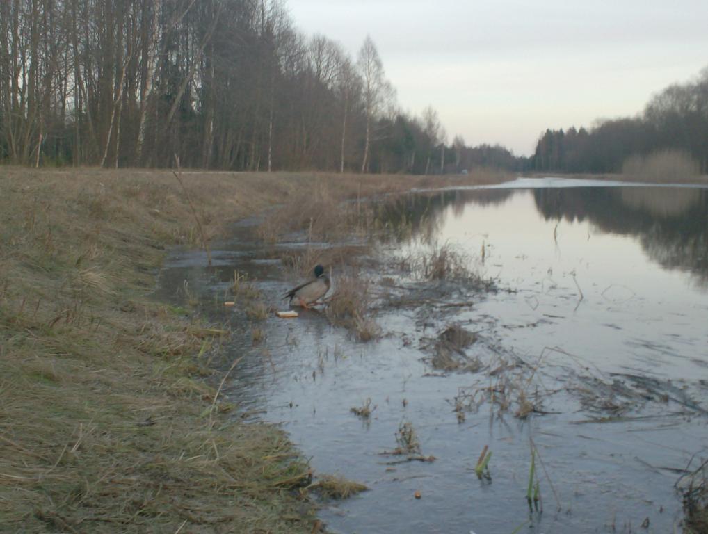 Подъехали мы утречком,а нас уже ждали.Охранное сопровождение на всю рыбалку,стоит всего пару бутербродов.Оно того стоит потому,как не обхойтися и без террористов.Хоть он и присутствовал этот раз в одном лице,приняв обличие селезня,был яно не из робкого десятка,лавируя меж полавками и лесками,лишь только стоило кинуть прикорма.На воде он чувствовал себя в безопасности.Требование,хоть и не было озвучено,но было понятно-тож хочу поесть.Пришлось выманивать на берег,тем что было:булка,печенье кукуруза.Так как береговая полоса была покрыта коркой льда,ему не легко дался выход,но получилось;и смешно же он смотрелся:как корова на льду.С удовольсвием откушав и рыбки,от которой сегодня натрез отказывался охранник,переодически напоминая о себе,требованием в получении очердного бутика.Как потом выиснилось,у них был заключён пакт о ненападении.Ну да ладно,хитрюги.Но за это они показали мленькое цирковое представление:Барбос натрескавшись бутиков решил попить,подошёл к берегу-лёд;смотрим что будет делать,а он лапой,не где-нибуть,а прям у камыша,где полегче постучл,вот те и вода.Селезень отобедав доедал булку в сухомятку,посля понял,что легче есть её размочив,взяв оставшуюся,отправился на воду,так и поступил.