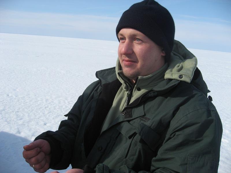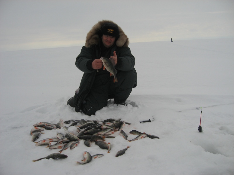Были погранцы, проверлили документы, сверились насчет машины. Сказали, что на лед пускать будут еще недели 2-3 как минимум, вопрос, какой лед будет в это время...В общем, рыбка присутсвовала, брала, порой даже активно. Поймав маленькую рыбу, ей, как положено наливали и отпускали в лунку – и тут же следовала поклевка солидного окуня!