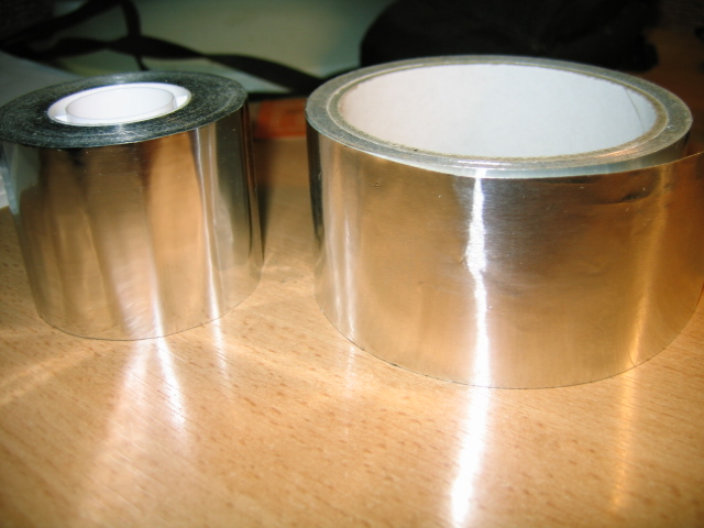 Вчера в строительном маркете я прикупил какой-то чудо скотч, который до этого в продаже не встречал, или м.б. просто не обращал внимания. Кажется похожая хрень но без липкой основы ещё применяется для оформления букетов цветов. Омметром эта штука не прозванивается в отличие от алюминиевого. Тонкий и липкий он до такой степени, что скорее всего можно мух на него ловить.