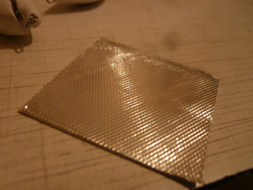 Это строительный алюминиевый скотч(самоклеющийся), 50р за 5 метров. Я делаю так - отрезаю нужный кусок скотча, на обратную сторону наклеиваю двустороннюю монтажную ленту толщиной примерно 1мм, и наклеиваю эту конструкцию на стол(удобно, держать не надо). Далее шпилькой М99х99 прокатываю под одним углом, потом под другим. Полумягкая прокладка из монтажной ленты очень помогает отпечатать текстуру на фолге за счет малой амортизации. А структура при наклейке на заготовку теряется, если слишком большой рельеф. При прокатке, насколько я понимаю, важен не рельеф, а сама текстура. Именно она и "играет" в лучах света. У меня способ очень похожий на тот, что был по ссылке NVN, только вместо обычной фольги - самоклеющаяся + подложка из ленты.