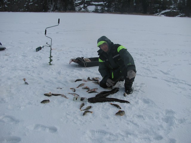 и забурились ну и понеслось,етот м$дак судак почемуто отказался клюват ,ну а окунь всетаки клевал ну сказем тоже средне ну вообчем кил по 40 за 2 дня всетаки накидали,ну рыбалка получилас трудовая,из лунки по 2-5 штук и все,отоидеш буквално 3 метра буришь и ест опят штук 5,короче дырок набурили там мора точно небудет,вообчем все отлично уже темнеет и пора домои,приехали поужинали попарилис в снегу покупалис