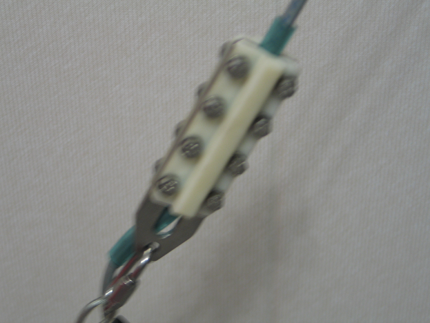 Кабельный зажим. В середине «П» образная скоба (нержавейка), по бокам обжимки (капролон) с радиусным пазом. На кабель надета трубка (силикон).