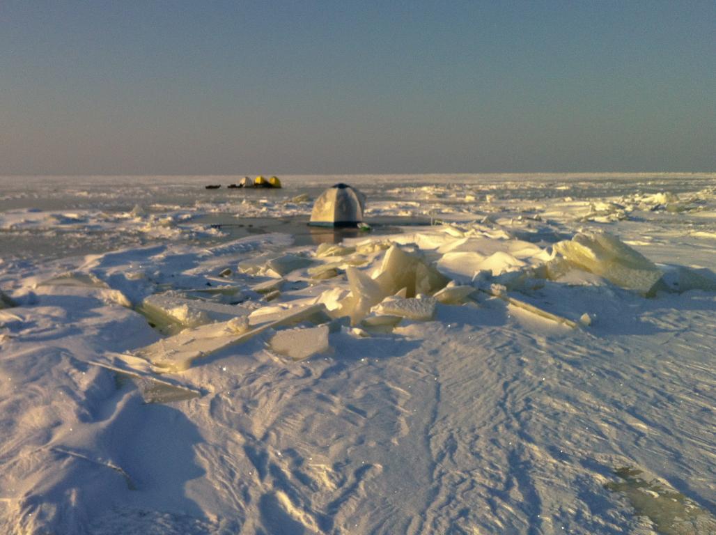 Покрутились на снежике по нескончаемым ломнякам и торосам и вернулись к парням. А у них там прям лагерь разбит из палаток. Сидят себе в тепле окуней жирнючих дубасят пачками, чАйОк попиваЮт, довольные... Кста Димас, где зачетная фотга Фила с мега окунем под килоху? Нуи мы присели, правда ненадолго, подергали окушков плотог хороших. Филовский паравоз уже отчалил, ну и мы подалися. На подходе к базе их нагнали вощем на финише были вместе.