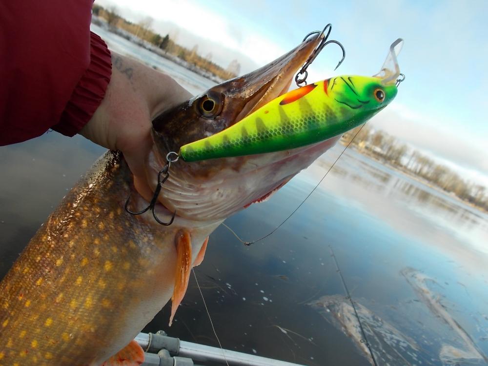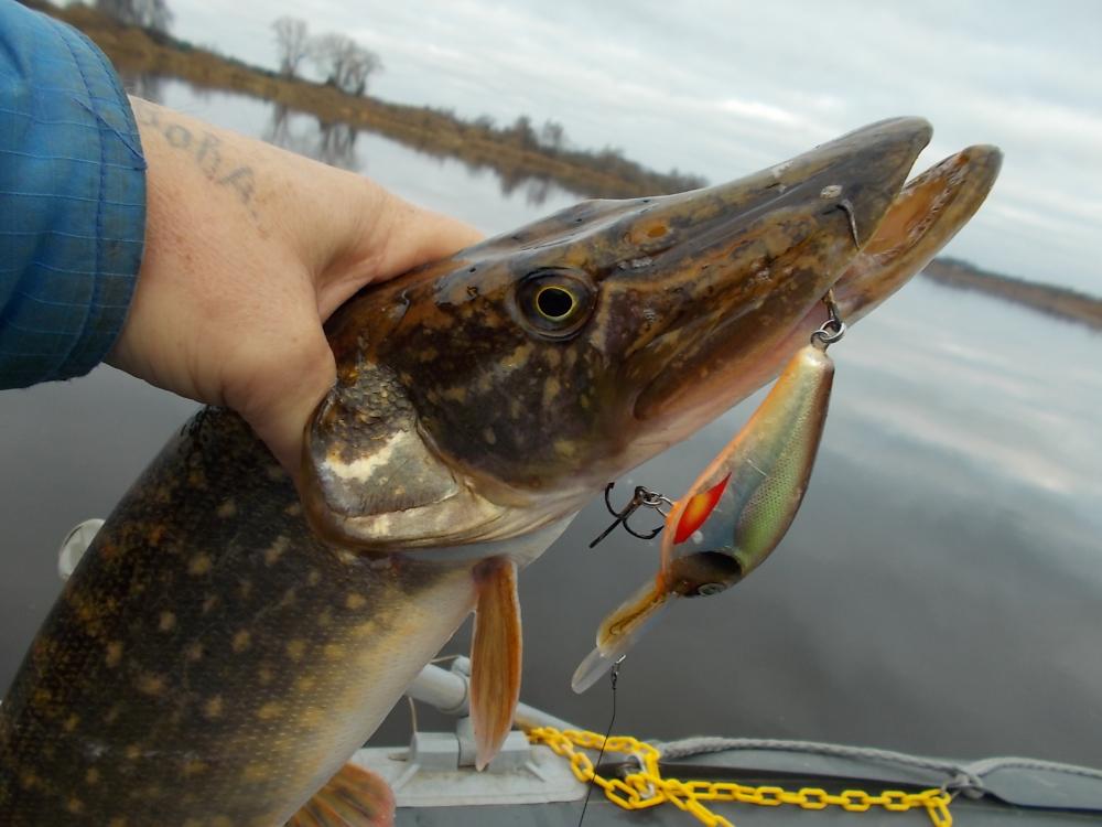 Утром было более менее тихо.Раздулся к обеду.Погода ломалась и щука знала все, гораздо лучше нас.Проплывая под лодкой, еле шевеля плавниками- просто игнорируя все предложенные приманки... Было всего два выхода,одного "шнурка" уговорил "не по честному "- (бодбагрилась снаружи)... Сделал фото и утопил (позвать родителей). Но на этом -всё! Ну и ладно!