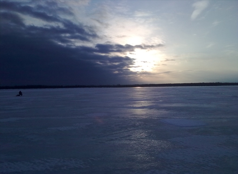 Утром по дороге -4*, ход отличный, как по асфальту дотопали на пятый км, на небе противостояние, что победит солнечная погода или тучи? Победило солнце, лёгкие облака быстро проносились нехилым верховым ветром. Низовой ветер то усиливался до метров 7-ми 8-ми, то почти стихал, ну и вокруг лунки чуток приходилось крутиться. В палатку не полез, т.к. всё время приходилось перемещаться, да и холодно особо не было, разве что с утра. Первые лунки, рыба не торопится, сел окушёк сковородничек, пара плотвин, потом на стоячую загиб, подсекаю, чувствую рыба хорошая. Шла неохотно, регулярные жёсткие остановки и потяжки, возле лунки увидел что это не ожидаемый лещ, а очень шустрая щучка грамм на 600-700. В дальнейшем навалились полосатые гликаны и я занялся поисками рыбы, малорезультативными.