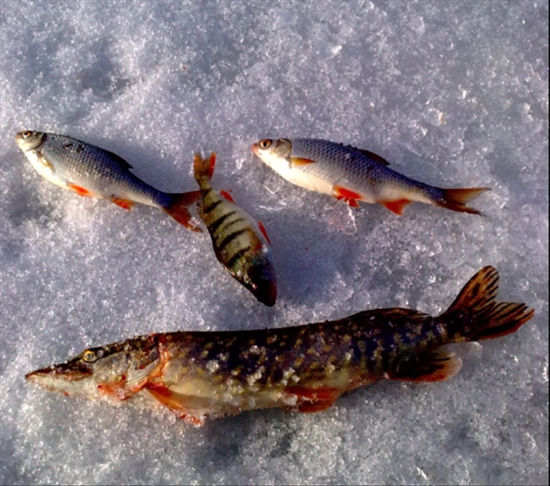 - в итоге прибыли на место где отловили в прошлые выходные - как могла случиться такая ошибка сразу на двух навигаторах осталось в загадках. Разбежались начали пробывать - кто сразу на мормышку - я на блесну. Нашел белые ,с виду перспективные места и начал поиски. На второй лунке на 3-4- взмахе получаю приятный удар - думал горбылек приличный - оказалоась щучка килошная. Пару лунок в стороне - попробывал мормышку плотва присутствует - но без фанатизма - подходами. Так и отловил в том месте целый день переходя одной лунки на другую потягиваю плотку ,переодичекси возвращаясь с блесной на щучью лунку - где в течение дня поимел еще несколько приличных окуней. У остальных уловы неплохие - не ВАРНЬЯ - но плотва отзывалась регулярно даи пара лещиков проскочила у товарищей.