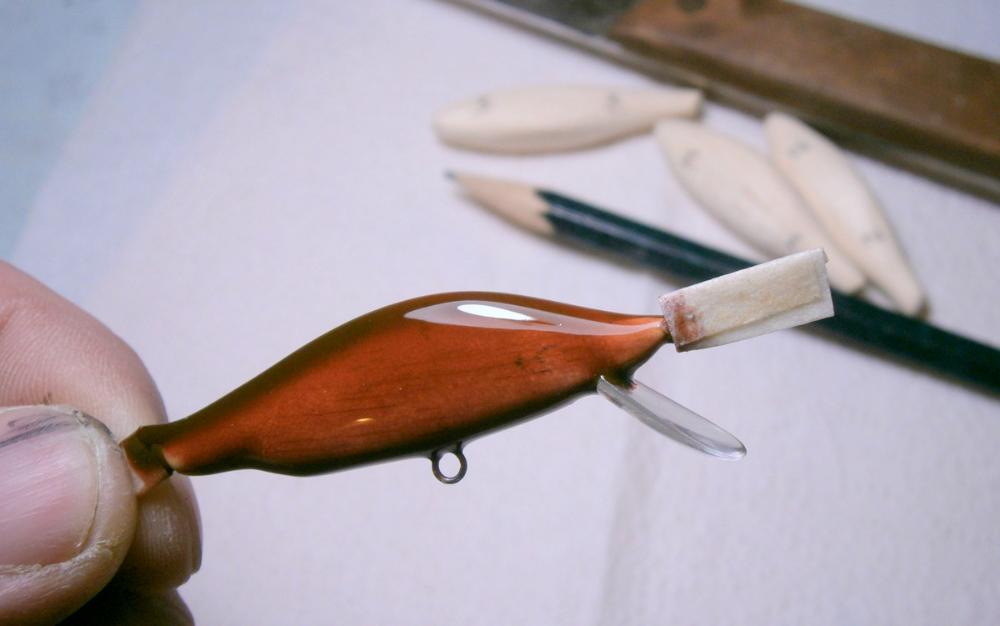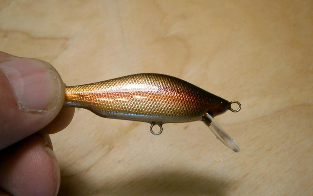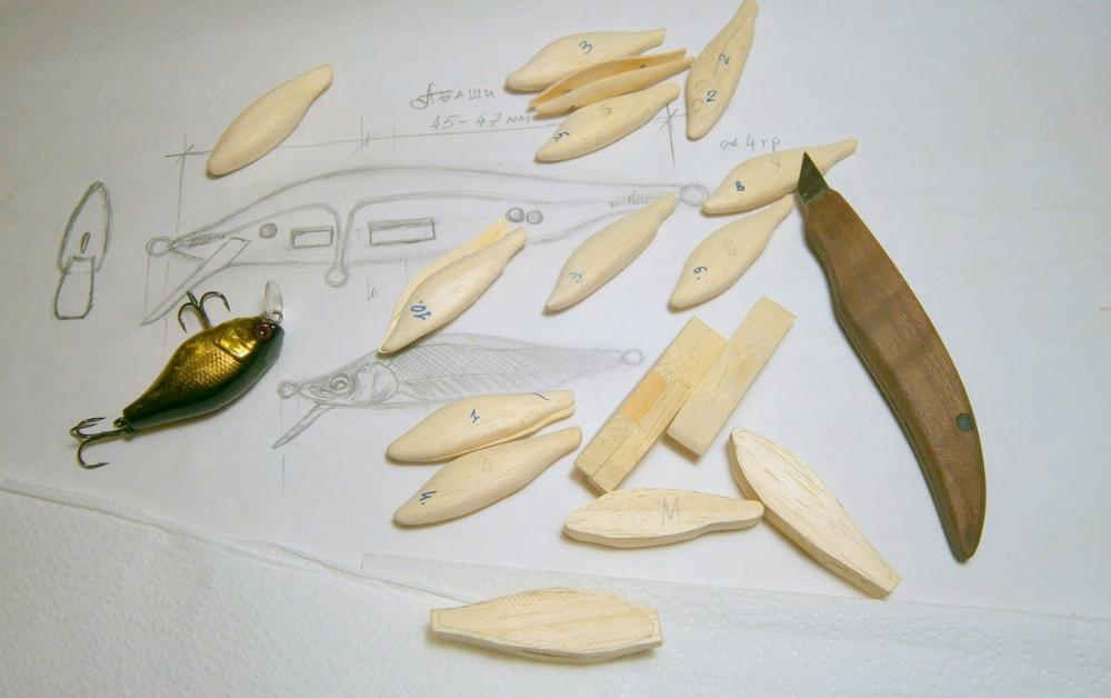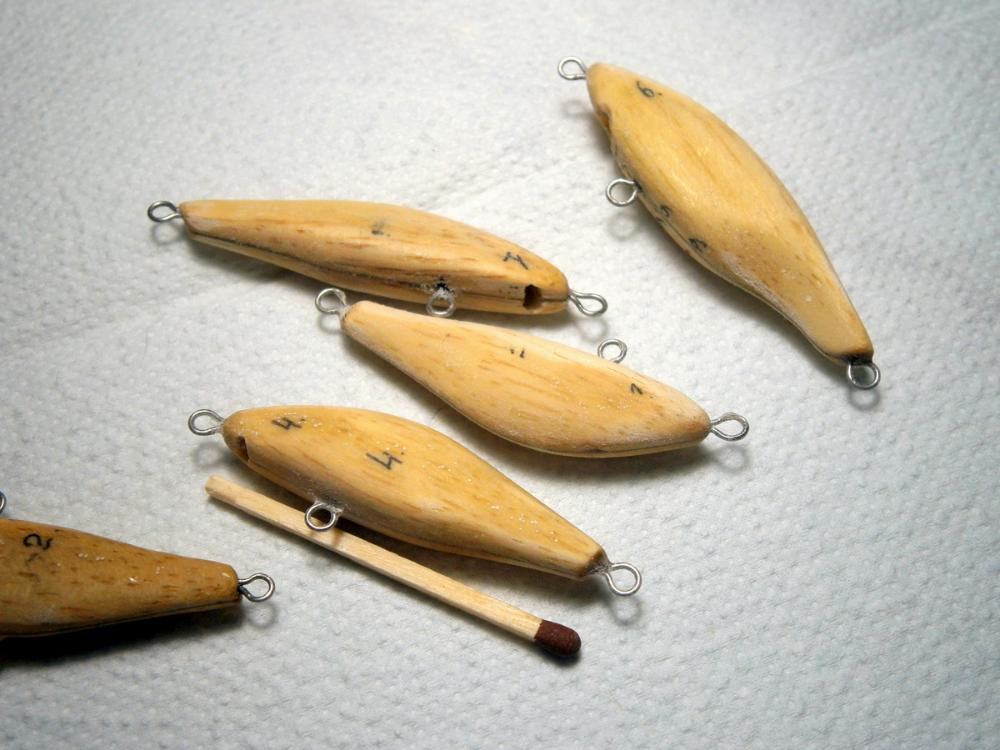 Здравствуйте! Медленно все у меня, я только учусь. Мечтал изготовить воблерочки для р.Юрюзань, и ее притоков, для течения. Осенью начал, попробовал, что даже получилось уже. На первой фотографии - просто рисунок, огрузка нарисована неправильно. Грузики - вольфрам, электрод "троечка". Только передний цилиндрик примерно в два раза длиннее того, что за центральной петлей. (доогружал свинцом и припоем, цилиндрики диам-м 3 мм, длиной 2-4 мм, по месту). На рисунке - это была моя ошибка, и то, с чем очень долго возился, пока в ванной они не стали, и "правильно" тонуть, покачиваясь с боку на бок, и работать стабильно, на любой скорости проводки (на втором фото уже испытанные в ванной многократно). Спасибо Олегу128 (Карпаты), за рентгеновские снимки. Абаши, 45-47мм, тонущие. Пропитал эпоксидной смолой. Проволока - нерж. сталь, 0,6 мм. Канавки прорезал гравером, сверло 1,5мм (дремель, бормашинка). Склеил половинки смолой эпоксидной, излишки потом удалил напильником, надфилем, наждачкой. Поликарбонат 2мм (щиток защитный, строительный, за 300 рублей), отполирован на войлочном круге, диаметром 20х100 мм. Врезал гравером, сверло 1,6 мм. Лопасть вклеил эпоксидным клеем, ВК-9, через 4-6 часов подкорректировал, подправил, в том числе проверив в ванной. "Загрунтовал" (перед фольгированием) - этой же смолой, только добавил капельку геля от ручки, пропуски, пробелы от кисти хорошо заметны. Фольга "самоклейка", "накатка" - сеточка, мелкая, синтетика (дамский шарфик), в тисках между двумя пластинками из винипласта, толщиной 10мм. Краска - (фон, первый слой) аэрографом - лак для ногтей. Глазки - 3мм, бумага фольгированная (не самоклейка, для детского творчества), цветная (40 руб. за 10 станд-х листов). Пробойник - трубочка стальная, точка золотистой краски, точка черной, дотсом, прозрачная смола, ювелирка. Глазки хотелось бы меньше, но зрение уже подводит. Углубления под глаза изготовил гравером, потом жаберные накладки - пленка рекламная, два слоя, и фольга. Осталось слой лака, покрасить через трафарет и финишный лак. Между делом, что-то "строгал",экспериментировал, огружал новые.