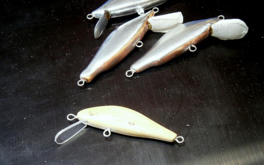 Бальза 40мм 3,2гр, + бальза 55мм 1,7гр. Пропитка пропионат, фольга, краска - баллончики, финиш ЛВ-1. Очень понравилась игра у 55мм, огрузкой выступают только крючки и каркас, думаю юзать для сплава под ветки и ночью на перекате за клыкастым!