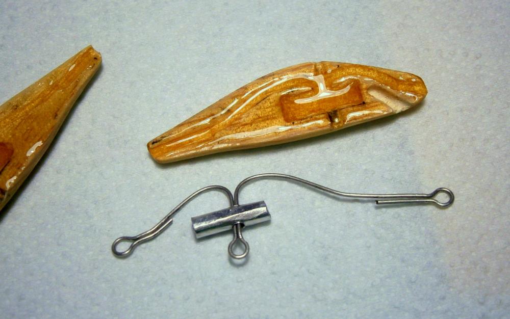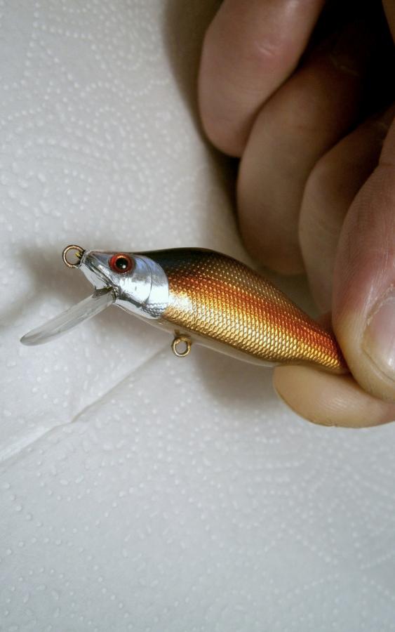 Здравствуйте! Медленно все у меня, я только учусь. Мечтал изготовить воблерочки для р.Юрюзань, и ее притоков, для течения. Осенью начал, попробовал, что даже получилось уже. На первой фотографии - просто рисунок, огрузка нарисована неправильно. Грузики - вольфрам, электрод "троечка". Только передний цилиндрик примерно в два раза длиннее того, что за центральной петлей. (доогружал свинцом и припоем, цилиндрики диам-м 3 мм, длиной 2-4 мм, по месту). На рисунке - это была моя ошибка, и то, с чем очень долго возился, пока в ванной они не стали, и "правильно" тонуть, покачиваясь с боку на бок, и работать стабильно, на любой скорости проводки (на втором фото уже испытанные в ванной многократно). Спасибо Олегу128 (Карпаты), за рентгеновские снимки. Абаши, 45-47мм, тонущие. Пропитал эпоксидной смолой. Проволока - нерж. сталь, 0,6 мм. Канавки прорезал гравером, сверло 1,5мм (дремель, бормашинка). Склеил половинки смолой эпоксидной, излишки потом удалил напильником, надфилем, наждачкой. Поликарбонат 2мм (щиток защитный, строительный, за 300 рублей), отполирован на войлочном круге, диаметром 20х100 мм. Врезал гравером, сверло 1,6 мм. Лопасть вклеил эпоксидным клеем, ВК-9, через 4-6 часов подкорректировал, подправил, в том числе проверив в ванной. "Загрунтовал" (перед фольгированием) - этой же смолой, только добавил капельку геля от ручки, пропуски, пробелы от кисти хорошо заметны. Фольга "самоклейка", "накатка" - сеточка, мелкая, синтетика (дамский шарфик), в тисках между двумя пластинками из винипласта, толщиной 10мм. Краска - (фон, первый слой) аэрографом - лак для ногтей. Глазки - 3мм, бумага фольгированная (не самоклейка, для детского творчества), цветная (40 руб. за 10 станд-х листов). Пробойник - трубочка стальная, точка золотистой краски, точка черной, дотсом, прозрачная смола, ювелирка. Глазки хотелось бы меньше, но зрение уже подводит. Углубления под глаза изготовил гравером, потом жаберные накладки - пленка рекламная, два слоя, и фольга. Осталось слой лака, покрасить через трафарет и финишный лак. Между делом, что-то "строгал",экспериментировал, огружал новые.