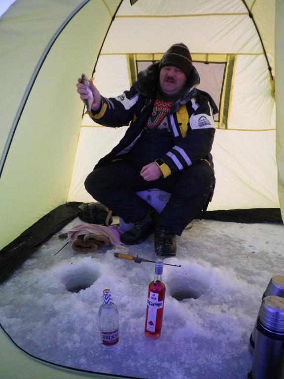 Но выдвинувшись на точку , пару раз по дороге вставал проверял в санках народ , если на пинок ногой шипели , значит ещё живые. На месте палатки собирались не на раз , но собрались , народ расселся кучно , стопки передавались друг другу, не выходя из палаток .Рыб да клЮвал , да и куда б он делся после такой штурмовой закормки .Но не в рыбе ж суть . Ближе к обеду пару рыбалеев тихонько начали поскуливать , через пол часика сильнее и не поймёшь , толи стопка до них не доходила , толи им уже много .