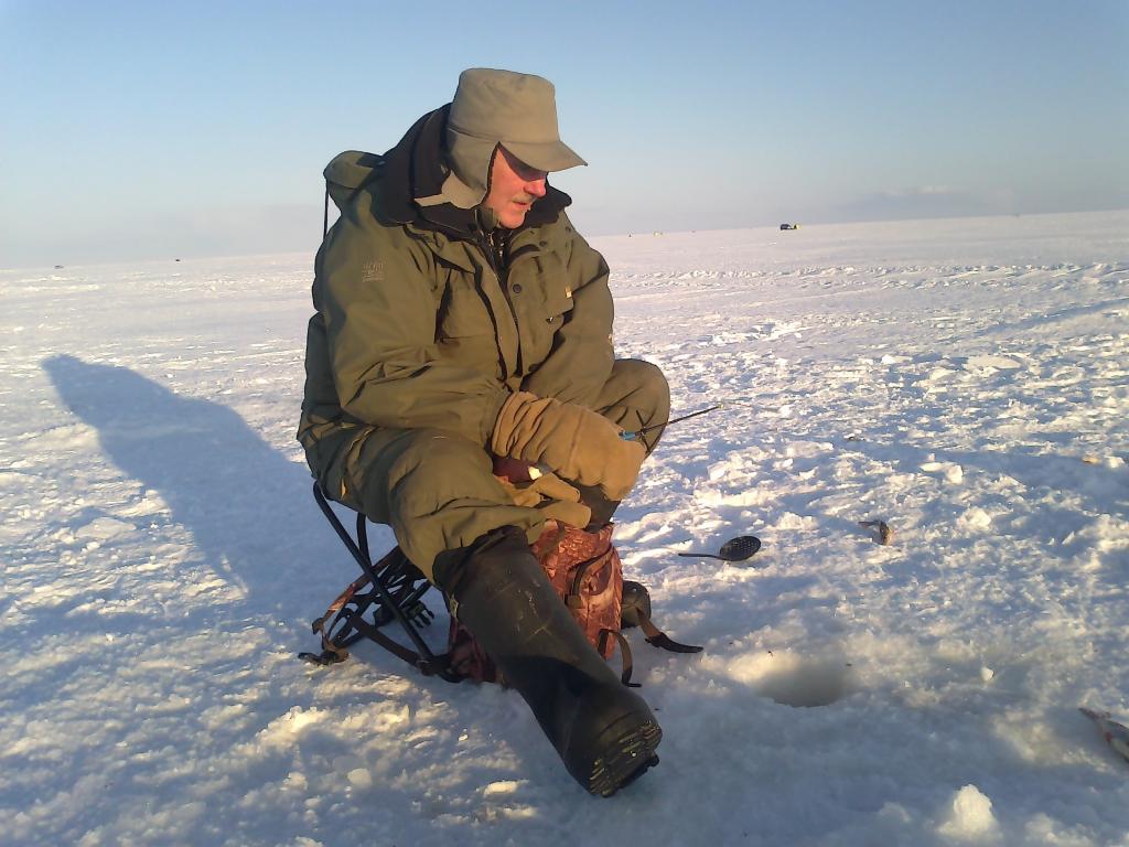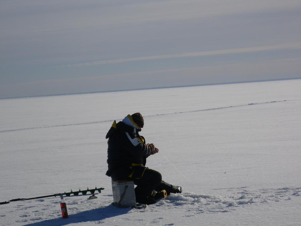 Первый день начинали ловить где то на 6м, - пусто. Потом поехали по следам, нашли место стоянки, где до этого несколько дней назад были рыбаки и судя по количеству прикормки вокруг замёрзших лунок, и оставленной таре (с Латвийской акцизной маркой), рыба тут была. Сделал быструю приборку за своими соотечественниками, поздравил жену с 8м марта, выпили с ней по рюмке и начали потихонечку располагаться. Друг был за рулём, поэтому он только закусывал
