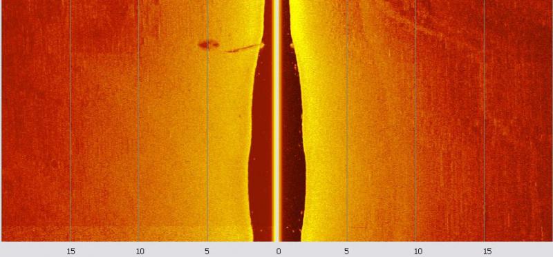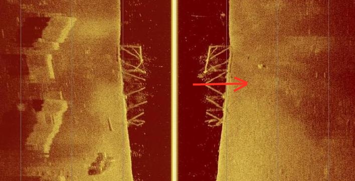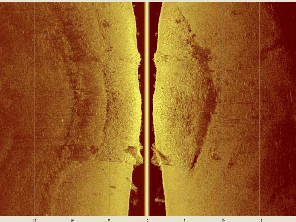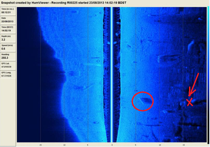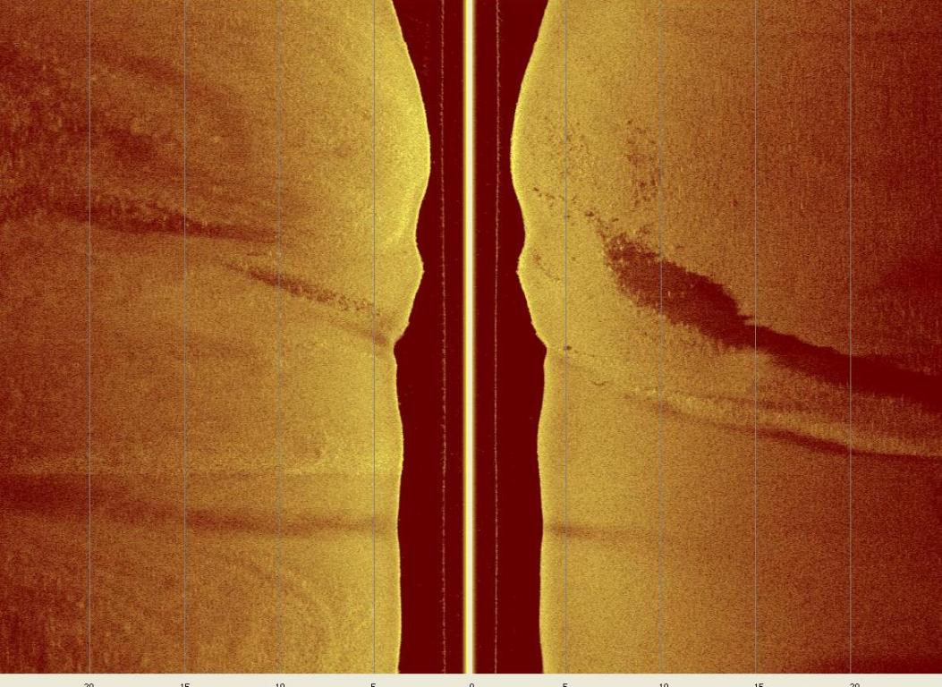 Все предыдущие скриншоты сделаны на искусственном водохранилище без всякой растительности, а вчера просканировал заросший плес: хорошо видны остатки чистого дна, ну и все бровки налицо. Для эксперементу утопил лысую покрышку от запорожца - ее видно еле еле и не с первого раза, но разглядеть можно, ну и особых иллюзий на этот счет питать не приходится. Однако для поиска перспективных мест SI то что надо