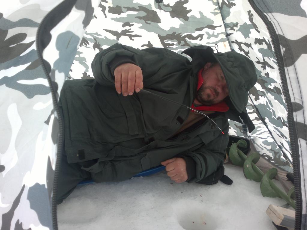 . Погода супер, солнце светит, небольшой мороз, штиль, сидел на льду в свитере и без шапки. Снегоходчики заколебали, зачем проезжать в двух-трех метрах от сидящих на льду?