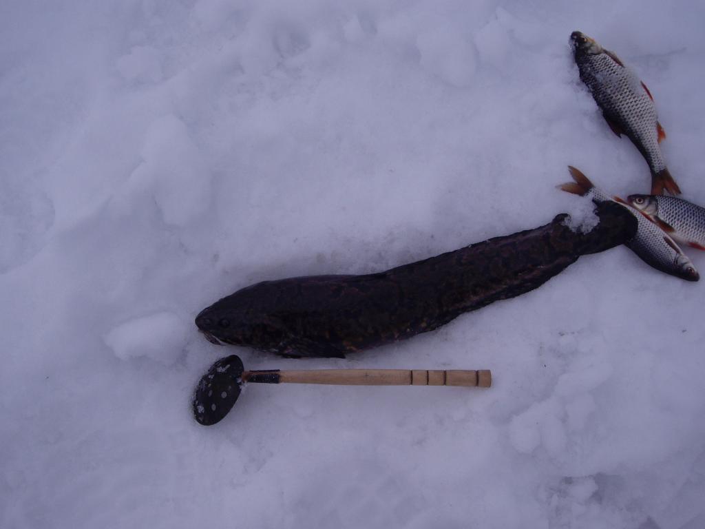 особенно на границе - камыши-земля. Да, с утра,на второй проводке, когда подкинул наживку - вязанку матылей, хапнула этого осьминога что-то солидное. Начал как всегда мотать на руки, а тут чувствую...нееее, не надо, лесочку стравил и начал вываживать. Чуть подниму, а рыбина как всадит и прижимает ко дну - понял, что так дейсвует налим. А я и не спешил, решил замучить и вываживал без выпендрежу - не пальчиками, а катушечкой, что б играла не только леска, но и наконечник удочки. И вот заходила вода в лунке, засыпанная снежком, а вот и хвостик показался, ну тут я руку в лунку, пальцем под жабру и ...на свет божий показался налим-красавчик. Ну радости было...