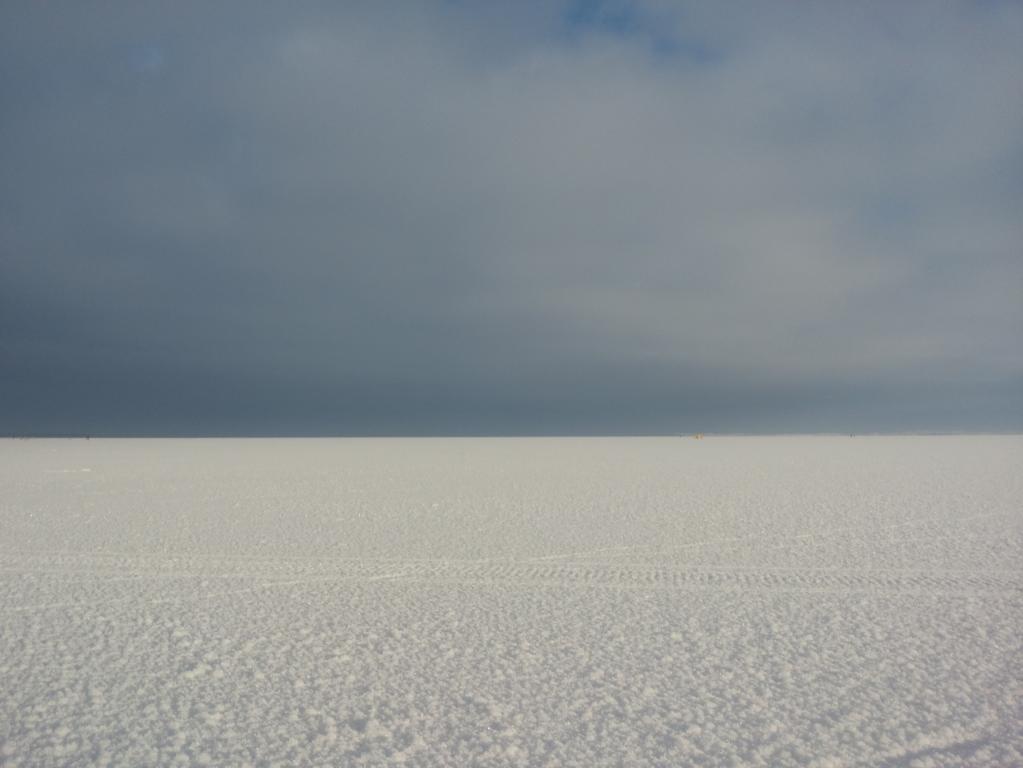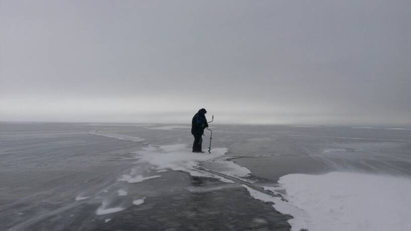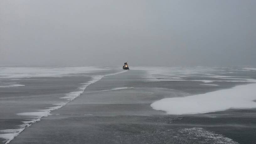 Как только выехали из бухты на просторы, то сразу почувствовали, что windguru со своими прогнозами не ошибся - бегущая по льду снежная поземка однозначно указывала на ветряное времяпровождение. Доверились нашему перевозчику и вместо прошлонедельной удачной точки приехали на другую, на 1.5 км ближе к берегу.