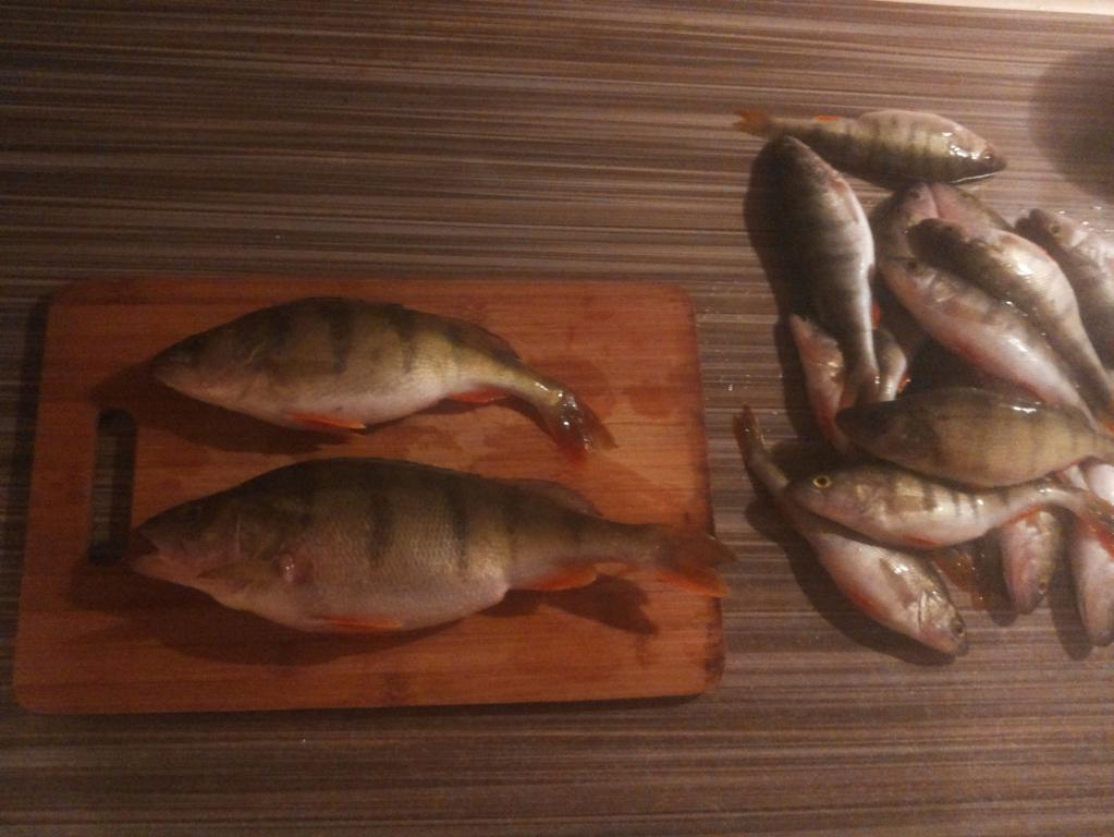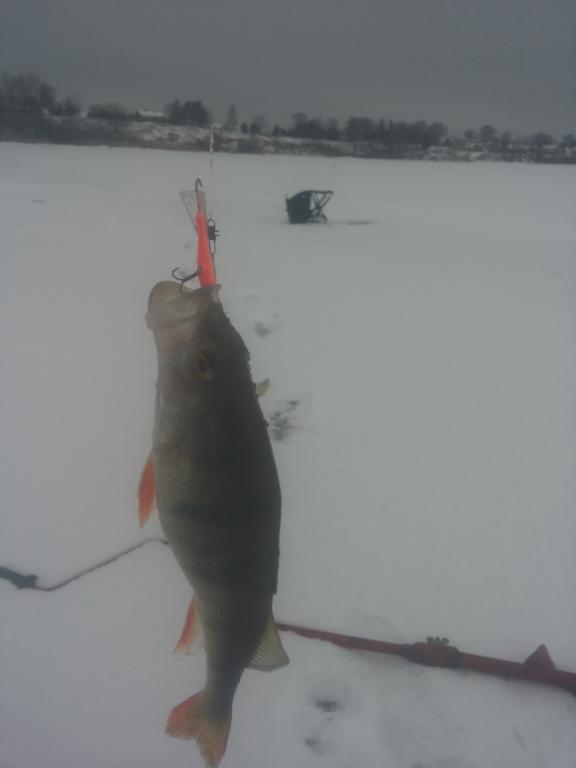 В субботу было предложение поехат с приятелем на снежике но всесив все обстоятельства решил выспатся...в воскресение же поехал в калласте..В общем искал искал....не нашёл..цель была именно крупняк...мелоч клевала..интересно что вертикальные блёсна окунь вообще игнорировал...в общем испытывая блёсна заметил что окунь стал активнее хватать Куусамовский баланс с раскраской под окуня..на него же взял и самую крупную рыбу...еще прощлый раз чистя рыбу заметил много окунёвой молоди в желудках...половил и вприглядку в этот раз...интересно что окуни поднимались под самый лёд за игрой баланса но все таки игра их больше отпугивала чем побуждала атаковать..В общем ловил и отпускал детей окунёвых...чтоб не уехать совсем пустым взял 4 кг...Тема до конца не раскрыта...будем искать дальше....