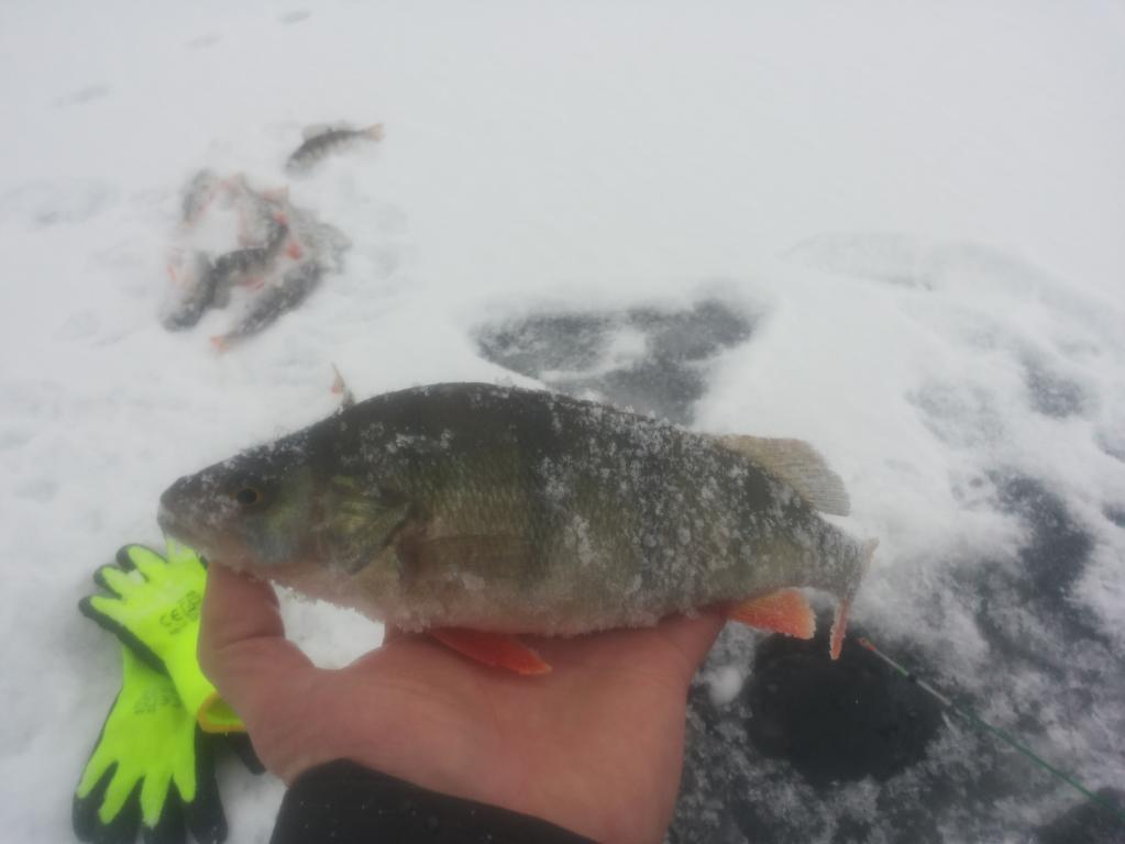 Второй день немного порадовал меньшим ветром и отсутствием снега. Но как говорится окунь был трудовой, с каждой последующей лунки удалось выманить используя сверхчеловеческие усилия не больше двух полосатиков, а порой и ничего.