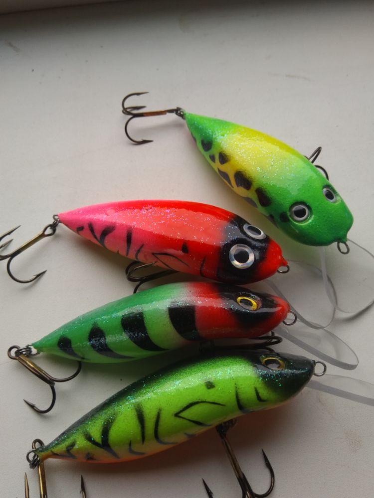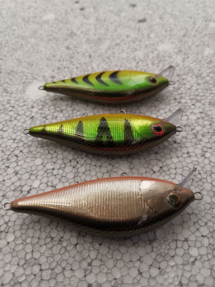 ну и выстругал из ПВХ трёхсоставничёк . Форму взял из головы, 18см. когда разрезал и соединил, то получилось около 20см. Огрузка перед передней петлёй и за ней. Покрытие : алюминиевый скотч с накаткой, лакировка каб лаком на колесе, покраска акриловыми красками, и 2 слоя энвиротекса, сушка так же на колесе. Игра воблеров в соответствующей теме.