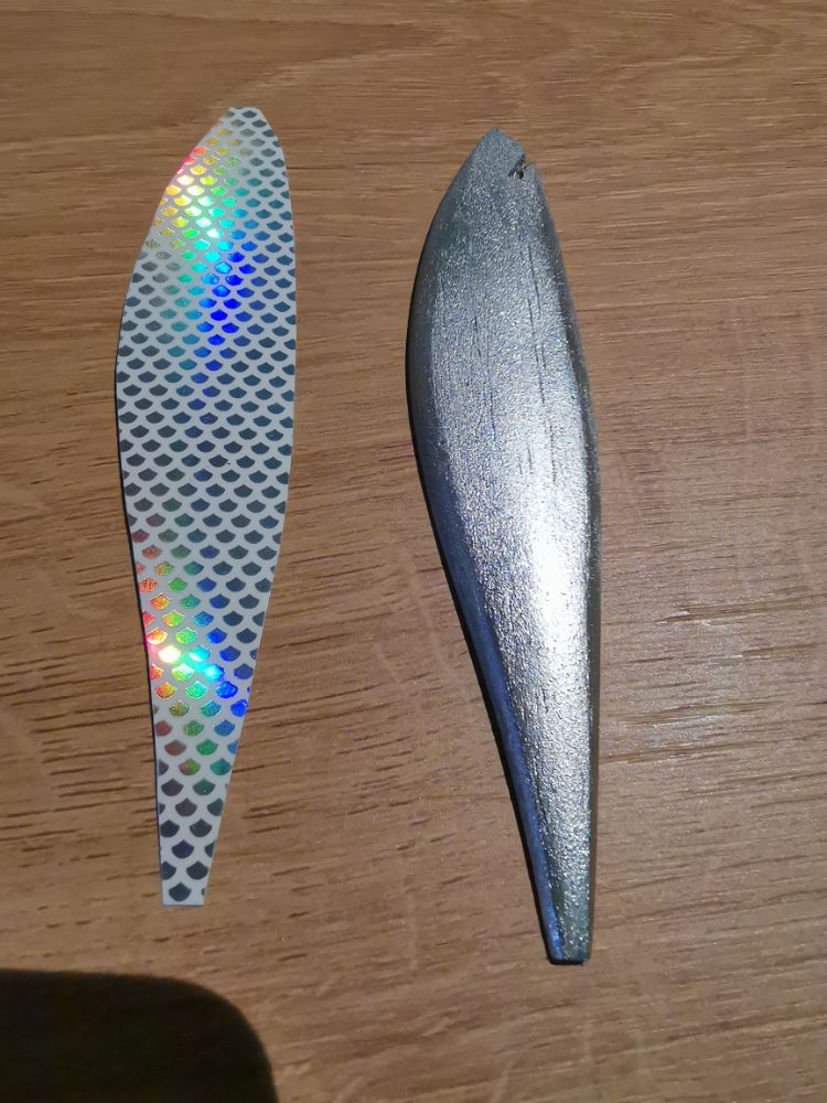 Ну вопервых нужно проверять не точечным светом, а ультрофиолетом (синим фонариком) Ну а про блеск... иногда конечно сработает, но не всегда. Не зря ведь металлические блёсна не всегда нужны блестящие. Но если хочется, то можно пробовать брать фольгу от упаковок : блёсен, зубной пасты и т. д. (она намного тоньше, правда не самоклейка) Или китайскую клеить, есть разные и тонкие и красивые, и под чешую... примерно такая, правда голограмма на фотке плохо видна, но она там есть