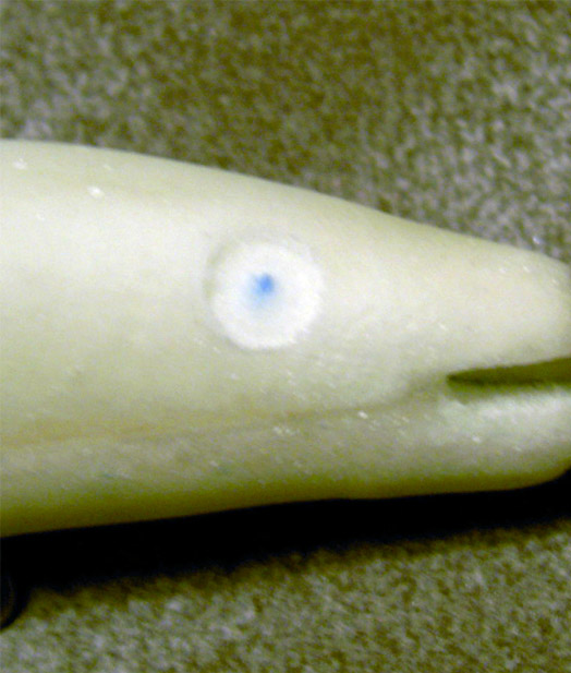 Где-то писал, но не в данном сабже... У меня тоже этот момент изначально не прошёл гладко. Насадка на самых низких оборотах "бор машинки" скакала по всей площади воблера и норовила забурить глазницу совсем не в нужном мне месте (на фотке в верху).Ikel писал(а):У меня тоже не получается вертикальной фрезой отверстия под глаза делать, уводит. Не сильно, но расположение глаз получается как у этого смайликаМне не понравилось. Пробовал на разных материалах. Даже когда шариком делаешь выемку, потом расширяешь вертикальной фрезой с выравниванием "глазного дна", то и в этом случае уводит.(...)