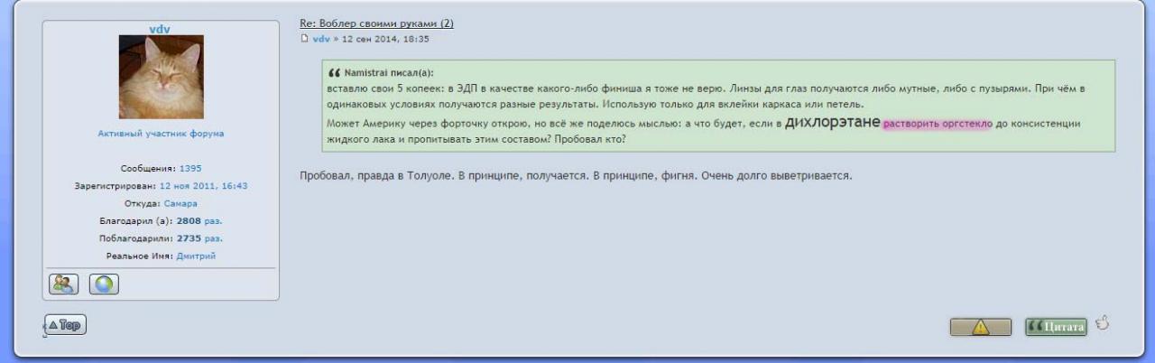 Ещё через несколько лет начну вырезать воблеры, ну а там правнуки может их доделаютАндрей С писал(а):Как видите, за несколько лет не весь растворитель улетучился (ничего дополнительно не доливал, сколько было изначально, не помню),