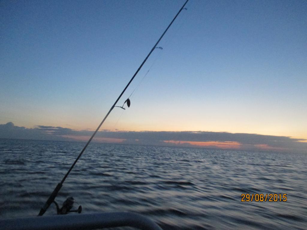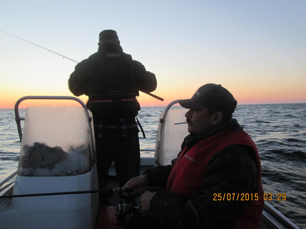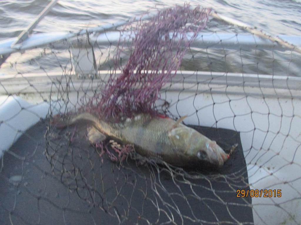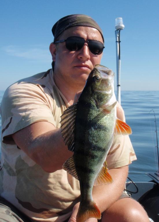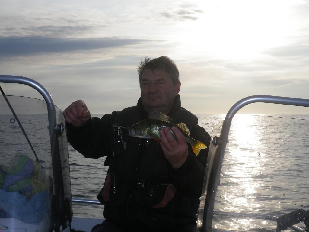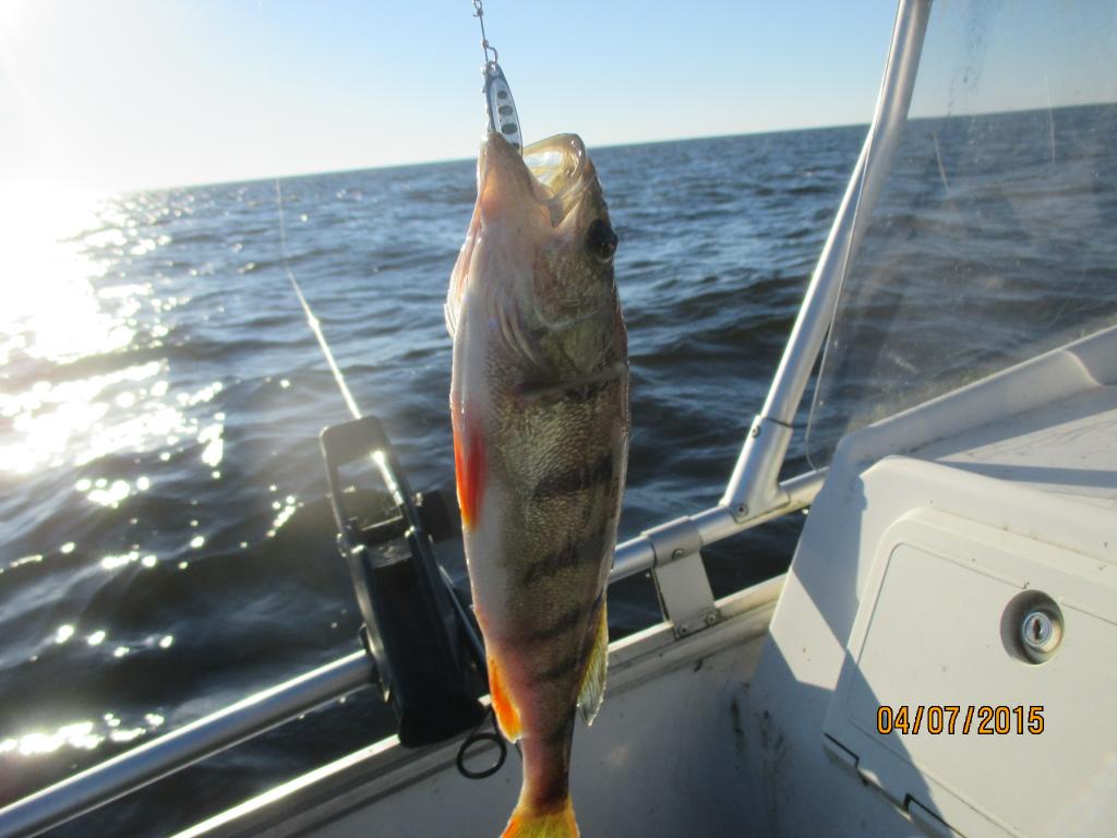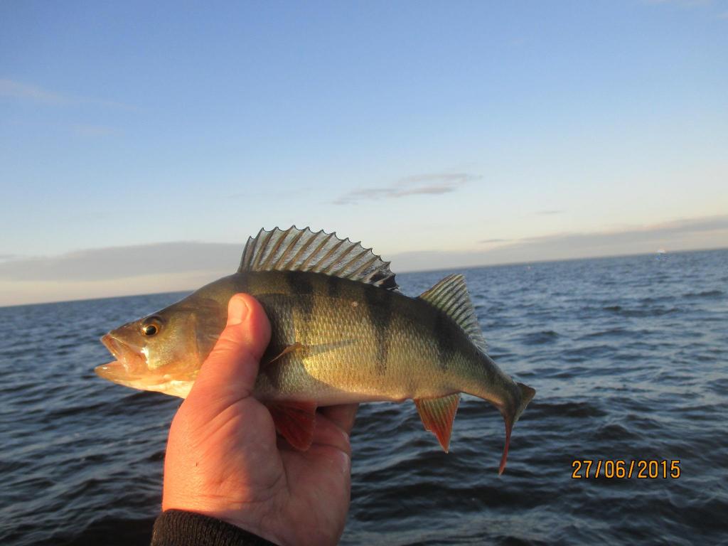 Начало дня 4 утра . Благоприятный ветер с берега , маленькая волнишка и окунь не заставил себя долго уговаривать .