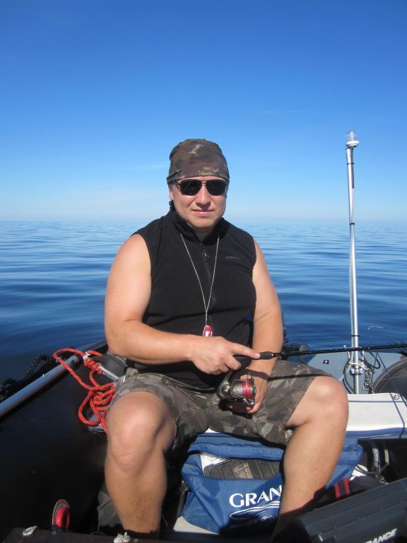 Проверяем несколько точек, с каждой доставая по нескольку окуньков «стандартного чудского размера», то есть, съедобного, но не более того. Заказа на рыбу нет, посему без зазрения совести рыбе даруется фридом, сиречь свобода. Ловятся преимущественно яркие окуньки! Подъезжаем к границе! Вот она граница! Но только в приборах навигации.. Никаких буйков, значков опознавательных, никаких буксиров. Супруга разочаровано фотографирует меня на фоне границе.
